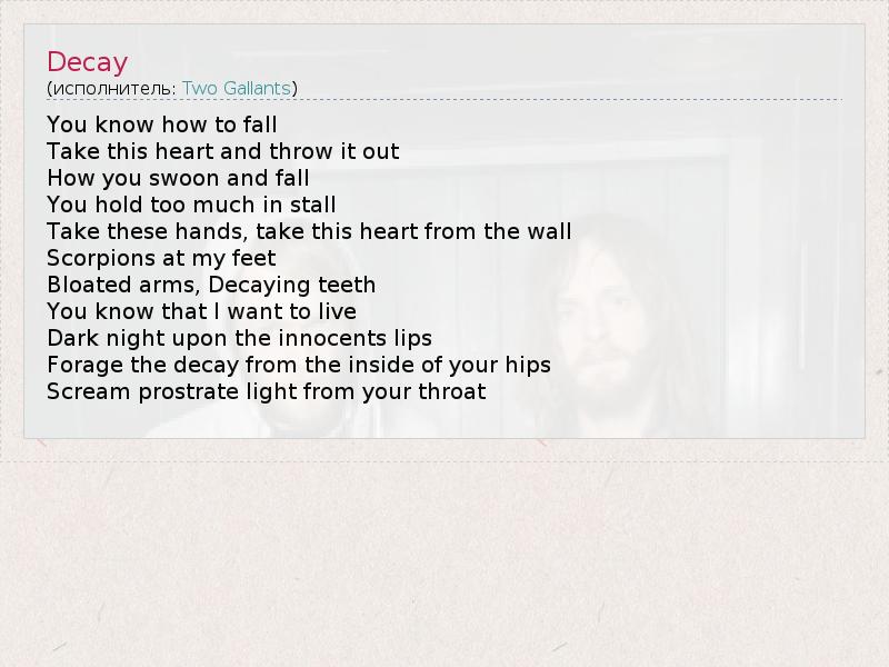 You know how to fall Take this heart and throw it out How you swoon and fall You hold too much in stall Take these hands, take this heart from the wall Scorpions at my feet Bloated arms, Decaying teeth You know that I want to live Dark night upon the innocents lips Forage the decay from the inside of your hips Scream prostrate light from your throat