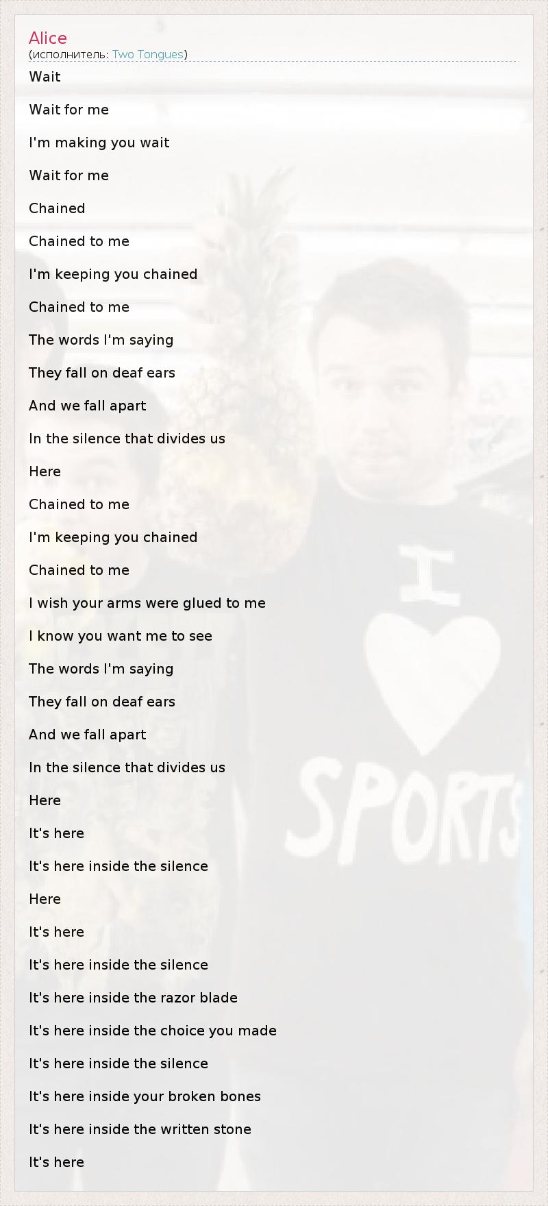 Wait Wait for me I'm making you wait Wait for me Chained Chained to me I'm keeping you chained Chained to me The words I'm saying They fall on deaf ears And we fall apart In the silence that divides us Here Chained to me I'm keeping you chained Chained to me I wish your arms were glued to me I know you want me to see The words I'm saying They fall on deaf ears And we fall apart In the silence that divides us Here It's here It's here inside the silence Here It's here It's here inside the silence It's here inside the razor blade It's here inside the choice you made It's here inside the silence It's here inside your broken bones It's here inside the written stone It's here