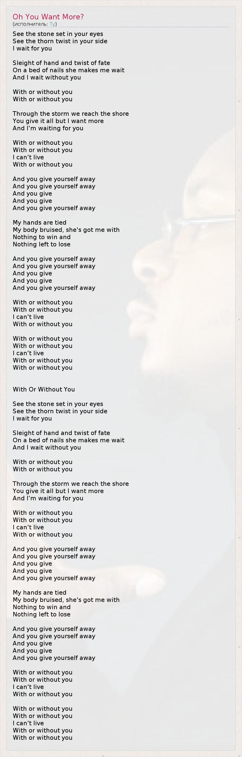 See the stone set in your eyes See the thorn twist in your side I wait for you Sleight of hand and twist of fate On a bed of nails she makes me wait And I wait without you With or without you With or without you Through the storm we reach the shore You give it all but I want more And I'm waiting for you With or without you With or without you I can't live With or without you And you give yourself away And you give yourself away And you give And you give And you give yourself away My hands are tied My body bruised, she's got me with Nothing to win and Nothing left to lose And you give yourself away And you give yourself away And you give And you give And you give yourself away With or without you With or without you I can't live With or without you With or without you With or without you I can't live With or without you With or without you With Or Without You See the stone set in your eyes See the thorn twist in your side I wait for you Sleight of hand and twist of fate On a bed of nails she makes me wait And I wait without you With or without you With or without you Through the storm we reach the shore You give it all but I want more And I'm waiting for you With or without you With or without you I can't live With or without you And you give yourself away And you give yourself away And you give And you give And you give yourself away My hands are tied My body bruised, she's got me with Nothing to win and Nothing left to lose And you give yourself away And you give yourself away And you give And you give And you give yourself away With or without you With or without you I can't live With or without you With or without you With or without you I can't live With or without you With or without you
