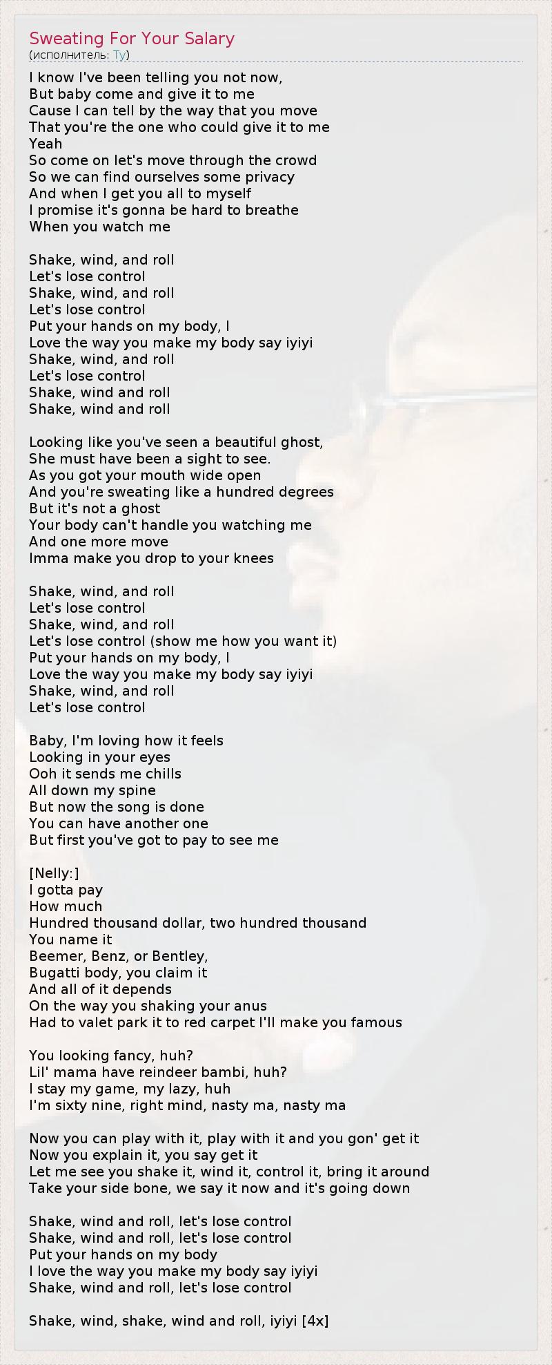 I know I've been telling you not now, But baby come and give it to me Cause I can tell by the way that you move That you're the one who could give it to me Yeah So come on let's move through the crowd So we can find ourselves some privacy And when I get you all to myself I promise it's gonna be hard to breathe When you watch me Shake, wind, and roll Let's lose control Shake, wind, and roll Let's lose control Put your hands on my body, I Love the way you make my body say iyiyi Shake, wind, and roll Let's lose control Shake, wind and roll Shake, wind and roll Looking like you've seen a beautiful ghost, She must have been a sight to see. As you got your mouth wide open And you're sweating like a hundred degrees But it's not a ghost Your body can't handle you watching me And one more move Imma make you drop to your knees Shake, wind, and roll Let's lose control Shake, wind, and roll Let's lose control (show me how you want it) Put your hands on my body, I Love the way you make my body say iyiyi Shake, wind, and roll Let's lose control Baby, I'm loving how it feels Looking in your eyes Ooh it sends me chills All down my spine But now the song is done You can have another one But first you've got to pay to see me [Nelly:] I gotta pay How much Hundred thousand dollar, two hundred thousand You name it Beemer, Benz, or Bentley, Bugatti body, you claim it And all of it depends On the way you shaking your anus Had to valet park it to red carpet I'll make you famous You looking fancy, huh? Lil' mama have reindeer bambi, huh? I stay my game, my lazy, huh I'm sixty nine, right mind, nasty ma, nasty ma Now you can play with it, play with it and you gon' get it Now you explain it, you say get it Let me see you shake it, wind it, control it, bring it around Take your side bone, we say it now and it's going down Shake, wind and roll, let's lose control Shake, wind and roll, let's lose control Put your hands on my body I love the way you make my body say iyiyi Shake, wind and roll, let's lose control Shake, wind, shake, wind and roll, iyiyi [4x]