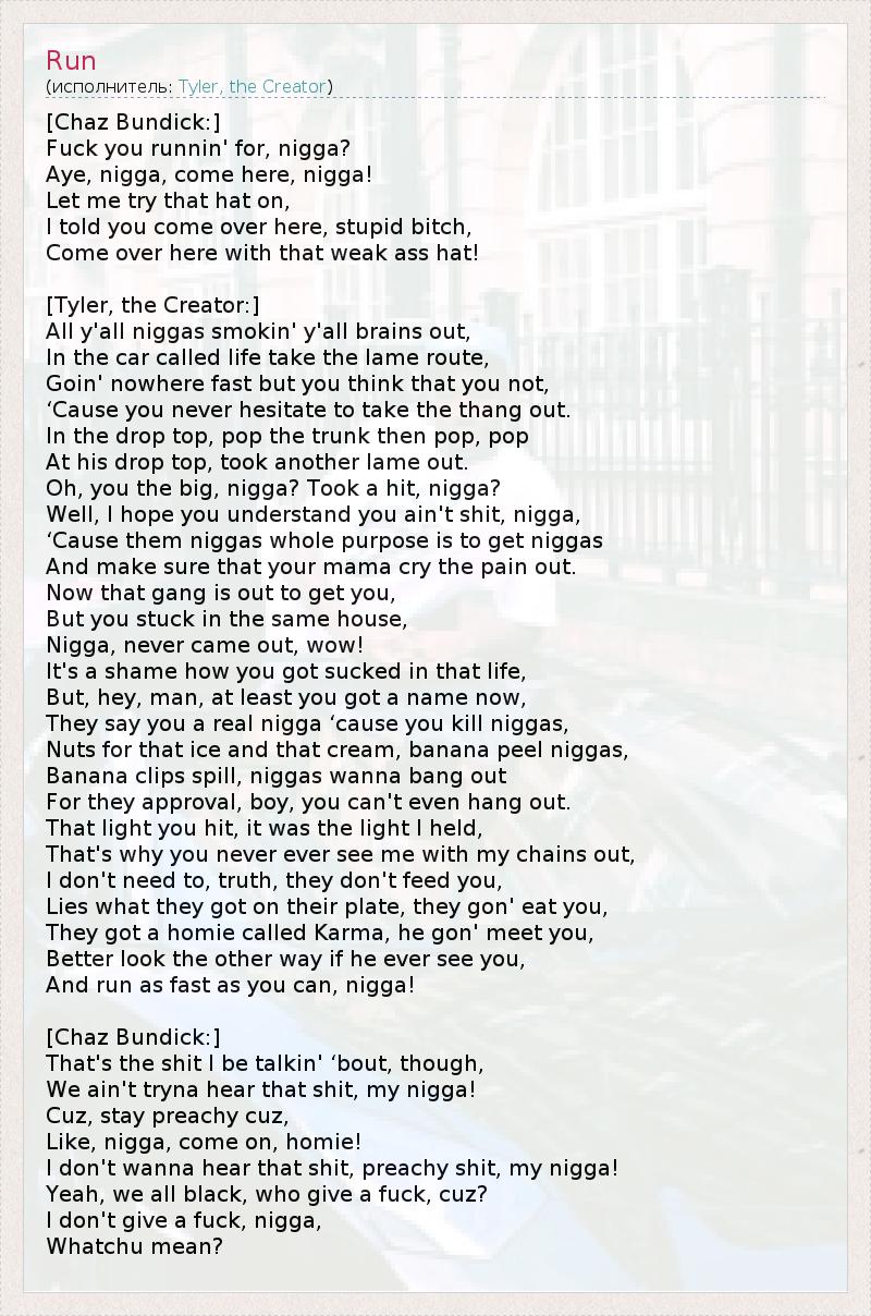 [Chaz Bundick:] На х** ты бежишь, ниггер? Э, ниггер, сюда иди, ниггер! Дай-ка кепку примерить, Я говорил тебе не приходить сюда, тупая мразь, Приходишь, значит, сюда с этой убогой кепкой! [Tyler, the Creator:] Все вы, ниггеры, себе мозги прокурили, В машине под названием жизнь вы едете по дурной дороге, Быстро движетесь в никуда, но думаете, что нет, Потому что не колеблетесь, вытаскивая ствол. В кабриолете открываете багажник — и пах-пах В его кабриолет, ещё одним лохом меньше. О, ты крут, ниггер? Затянулся, ниггер? Ну, надеюсь, ты поймёшь, что ни х** в тебе нет, ниггер, Потому что вся цель таких ниггеров — доставать ниггеров, Убедись, что твоя мама плачет от переживаний. Теперь банда охотится за тобой, Но ты застрял в том же доме, Ниггер никогда не выходил, ого! Ты позорно вляпался в такую жизнь, Ну, блин, чувак, по крайней мере, ты сделал себе имя, Про тебя говорят, что ты реальный ниггер, раз убиваешь других ниггеров, Сходишь с ума по брюликам и бабкам, подкидываешь подлянки ниггерам, Вываливаешь обоймы, ниггеры хотят палить За одобрение, господи, даже не потусить. Свет, на который ты налетел, шёл от меня, Поэтому ты никогда-никогда не увидишь меня в цепях, Мне не нужно, правда, они тебя не накормят, На их тарелках ложь, они сожрут тебя, Их них братишка по имени Карма, он тебя настигнет, Лучше отводи взгляд, если хоть раз увидишь его И беги со всех ног, ниггер! [Chaz Bundick:] Вот, про что я базарю, Мы не собираемся слушать эту х**нь, мой ниггер! Браток, втирай дальше, браток, Да ну, ниггер, брось, братишка! Я не хочу слшать эту х**нь, поучительную, мой ниггер! Да, мы все чёрные, но кого это е**т, браток? Мне по х**, ниггер, В каком смысле?
