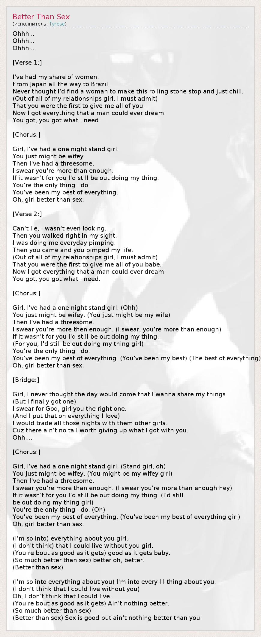 Ohhh... Ohhh... Ohhh... [Verse 1:] I've had my share of women. From Japan all the way to Brazil. Never thought I'd find a woman to make this rolling stone stop and just chill. (Out of all of my relationships girl, I must admit) That you were the first to give me all of you. Now I got everything that a man could ever dream. You got, you got what I need. [Chorus:] Girl, I've had a one night stand girl. You just might be wifey. Then I've had a threesome. I swear you're more than enough. If it wasn't for you I'd still be out doing my thing. You're the only thing I do. You've been my best of everything. Oh, girl better than sex. [Verse 2:] Can't lie, I wasn't even looking. Then you walked right in my sight. I was doing me everyday pimping. Then you came and you pimped my life. (Out of all of my relationships girl, I must admit) That you were the first to give me all of you babe. Now I got everything that a man could ever dream. You got, you got what I need. [Chorus:] Girl, I've had a one night stand girl. (Ohh) You just might be wifey. (You just might be my wife) Then I've had a threesome. I swear you're more then enough. (I swear, you're more than enough) If it wasn't for you I'd still be out doing my thing. (For you, I'd still be out doing my thing girl) You're the only thing I do. You've been my best of everything. (You've been my best) (The best of everything) Oh, girl better than sex. [Bridge:] Girl, I never thought the day would come that I wanna share my things. (But I finally got one) I swear for God, girl you the right one. (And I put that on everything I love) I would trade all those nights with them other girls. Cuz there ain't no tail worth giving up what I got with you. Ohh.... [Chorus:] Girl, I've had a one night stand girl. (Stand girl, oh) You just might be wifey. (You might be my wifey girl) Then I've had a threesome. I swear you're more than enough. (I swear you're more than enough hey) If it wasn't for you I'd still be out doing my thing. (I'd still be out doing my thing girl) You're the only thing I do. (Oh) You've been my best of everything. (You've been my best of everything girl) Oh, girl better than sex. (I'm so into) everything about you girl. (I don't think) that I could live without you girl. (You're bout as good as it gets) good as it gets baby. (So much better than sex) better oh, better. (Better than sex) (I'm so into everything about you) I'm into every lil thing about you. (I don't think that I could live without you) Oh, I don't think that I could live. (You're bout as good as it gets) Ain't nothing better. (So much better than sex) (Better than sex) Sex is good but ain't nothing better than you.