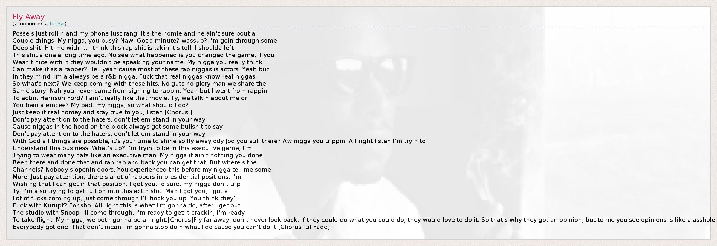 To take flight. My nigga, we both gonna be all right.[Chorus]Fly far away, don't never look back. If they could do what you could do, they would love to do it. So that's why they got an opinion, but to me you see opinions is like a asshole,