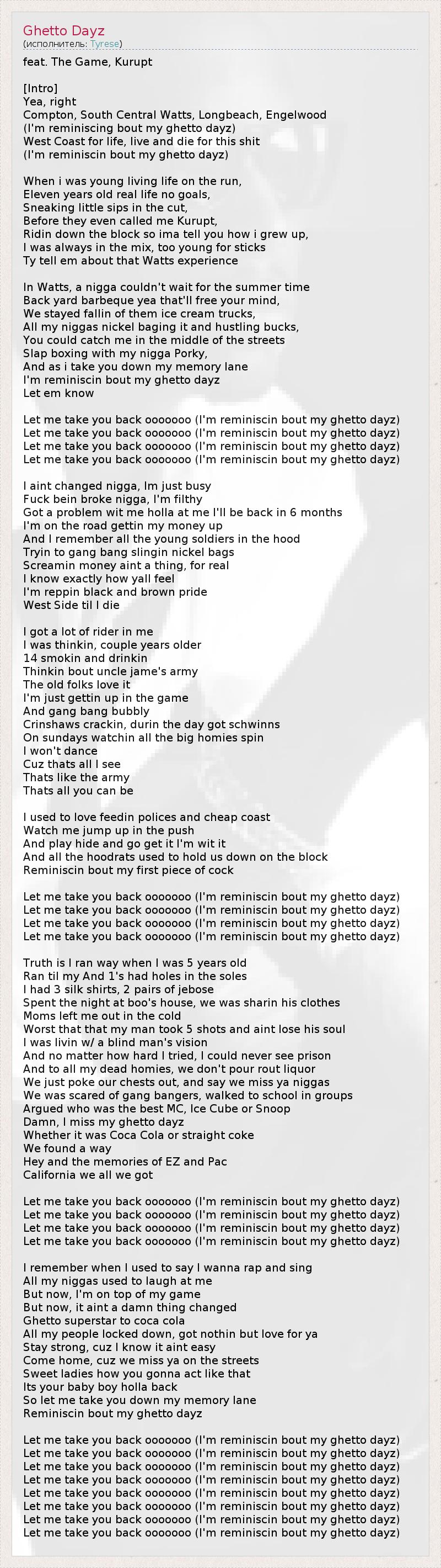 I'm reminiscin bout my ghetto dayz