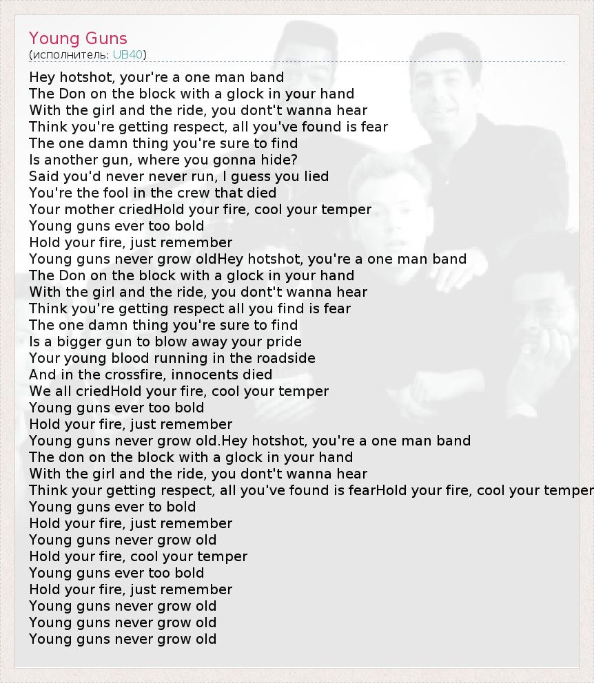 Hey hotshot, your're a one man band The Don on the block with a glock in your hand With the girl and the ride, you dont't wanna hear Think you're getting respect, all you've found is fear The one damn thing you're sure to find Is another gun, where you gonna hide? Said you'd never never run, I guess you lied You're the fool in the crew that died Your mother criedHold your fire, cool your temper Young guns ever too bold Hold your fire, just remember Young guns never grow oldHey hotshot, you're a one man band The Don on the block with a glock in your hand With the girl and the ride, you dont't wanna hear Think you're getting respect all you find is fear The one damn thing you're sure to find Is a bigger gun to blow away your pride Your young blood running in the roadside And in the crossfire, innocents died We all criedHold your fire, cool your temper Young guns ever too bold Hold your fire, just remember Young guns never grow old.Hey hotshot, you're a one man band The don on the block with a glock in your hand With the girl and the ride, you dont't wanna hear Think your getting respect, all you've found is fearHold your fire, cool your temper Young guns ever to bold Hold your fire, just remember Young guns never grow old Hold your fire, cool your temper Young guns ever too bold Hold your fire, just remember Young guns never grow old Young guns never grow old Young guns never grow old