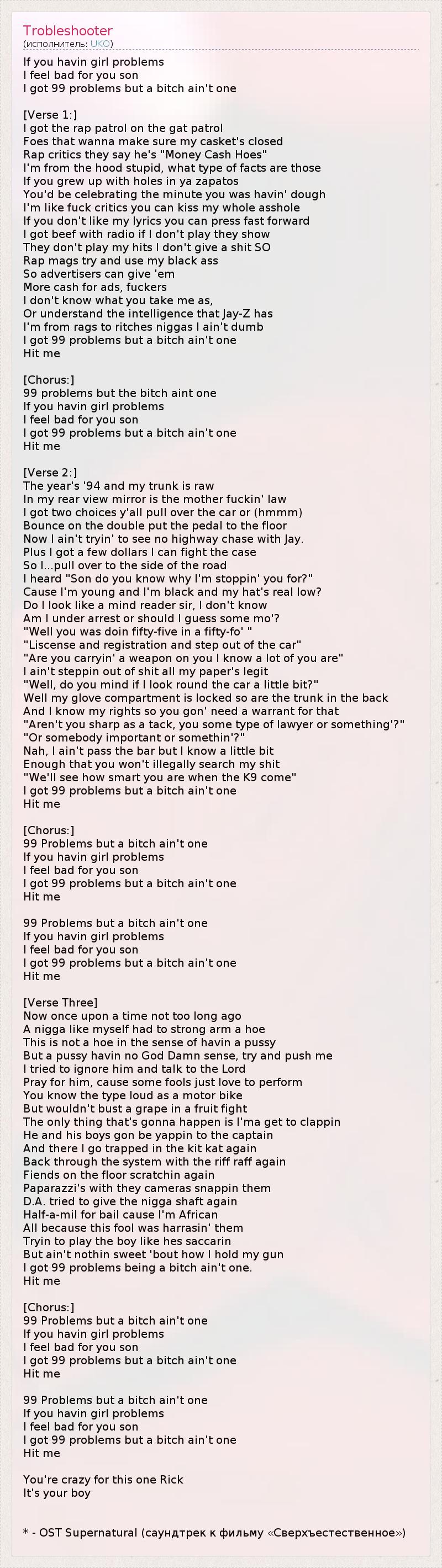 If you havin girl problems I feel bad for you son I got 99 problems but a bitch ain't one [Verse 1:] I got the rap patrol on the gat patrol Foes that wanna make sure my casket's closed Rap critics they say he's "Money Cash Hoes" I'm from the hood stupid, what type of facts are those If you grew up with holes in ya zapatos You'd be celebrating the minute you was havin' dough I'm like fuck critics you can kiss my whole asshole If you don't like my lyrics you can press fast forward I got beef with radio if I don't play they show They don't play my hits I don't give a shit SO Rap mags try and use my black ass So advertisers can give 'em More cash for ads, fuckers I don't know what you take me as, Or understand the intelligence that Jay-Z has I'm from rags to ritches niggas I ain't dumb I got 99 problems but a bitch ain't one Hit me [Chorus:] 99 problems but the bitch aint one If you havin girl problems I feel bad for you son I got 99 problems but a bitch ain't one Hit me [Verse 2:] The year's '94 and my trunk is raw In my rear view mirror is the mother fuckin' law I got two choices y'all pull over the car or (hmmm) Bounce on the double put the pedal to the floor Now I ain't tryin' to see no highway chase with Jay. Plus I got a few dollars I can fight the case So I...pull over to the side of the road I heard "Son do you know why I'm stoppin' you for?" Cause I'm young and I'm black and my hat's real low? Do I look like a mind reader sir, I don't know Am I under arrest or should I guess some mo'? "Well you was doin fifty-five in a fifty-fo' " "Liscense and registration and step out of the car" "Are you carryin' a weapon on you I know a lot of you are" I ain't steppin out of shit all my paper's legit "Well, do you mind if I look round the car a little bit?" Well my glove compartment is locked so are the trunk in the back And I know my rights so you gon' need a warrant for that "Aren't you sharp as a tack, you some type of lawyer or something'?" "Or somebody important or somethin'?" Nah, I ain't pass the bar but I know a little bit Enough that you won't illegally search my shit "We'll see how smart you are when the K9 come" I got 99 problems but a bitch ain't one Hit me [Chorus:] 99 Problems but a bitch ain't one If you havin girl problems I feel bad for you son I got 99 problems but a bitch ain't one Hit me 99 Problems but a bitch ain't one If you havin girl problems I feel bad for you son I got 99 problems but a bitch ain't one Hit me [Verse Three] Now once upon a time not too long ago A nigga like myself had to strong arm a hoe This is not a hoe in the sense of havin a pussy But a pussy havin no God Damn sense, try and push me I tried to ignore him and talk to the Lord Pray for him, cause some fools just love to perform You know the type loud as a motor bike But wouldn't bust a grape in a fruit fight The only thing that's gonna happen is I'ma get to clappin He and his boys gon be yappin to the captain And there I go trapped in the kit kat again Back through the system with the riff raff again Fiends on the floor scratchin again Paparazzi's with they cameras snappin them D.A. tried to give the nigga shaft again Half-a-mil for bail cause I'm African All because this fool was harrasin' them Tryin to play the boy like hes saccarin But ain't nothin sweet 'bout how I hold my gun I got 99 problems being a bitch ain't one. Hit me [Chorus:] 99 Problems but a bitch ain't one If you havin girl problems I feel bad for you son I got 99 problems but a bitch ain't one Hit me 99 Problems but a bitch ain't one If you havin girl problems I feel bad for you son I got 99 problems but a bitch ain't one Hit me You're crazy for this one Rick It's your boy * - OST Supernatural (саундтрек к фильму «Сверхъестественное»)