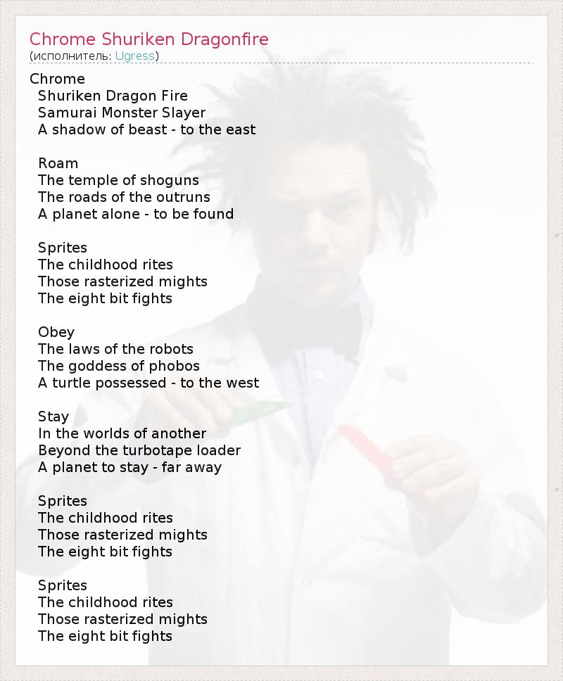 А как ты думаешь, о чем песня "Chrome Shuriken Dragonfire" ?