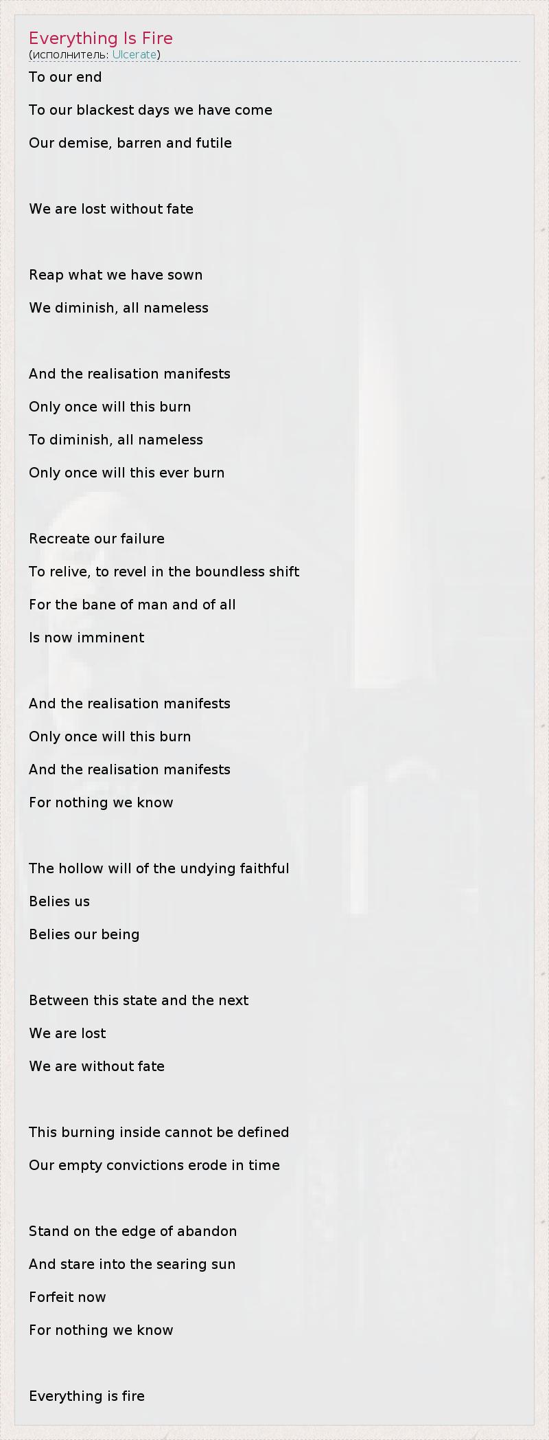 To our end To our blackest days we have come Our demise, barren and futile We are lost without fate Reap what we have sown We diminish, all nameless And the realisation manifests Only once will this burn To diminish, all nameless Only once will this ever burn Recreate our failure To relive, to revel in the boundless shift For the bane of man and of all Is now imminent And the realisation manifests Only once will this burn And the realisation manifests For nothing we know The hollow will of the undying faithful Belies us Belies our being Between this state and the next We are lost We are without fate This burning inside cannot be defined Our empty convictions erode in time Stand on the edge of abandon And stare into the searing sun Forfeit now For nothing we know Everything is fire