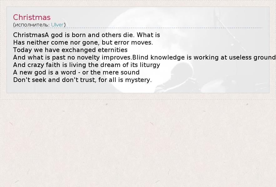 Это интересно:Ulver (у́лвер, норв. волки) — норвежский музыкальный ансамбль, образовавшийся в 1993 году. С каждым выпуском музыка Ulver менялась в стиле; разные альбомы причислялись к жанрам блэк-метал, неофолк, трип-хоп и авангардный метал.СозданиеГруппа была образована в 1993 году Кристофером Рюггом, выбравшим псевдоним Гарм — в честь персонажа скандинавской мифологии, и барабанщиком... продолжение