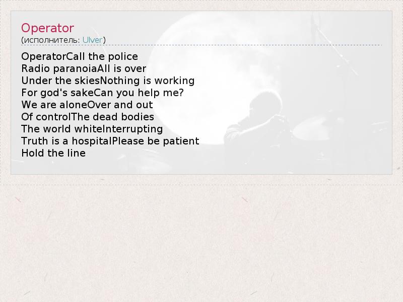 Это интересно:Ulver (у́лвер, норв. волки) — норвежский музыкальный ансамбль, образовавшийся в 1993 году. С каждым выпуском музыка Ulver менялась в стиле; разные альбомы причислялись к жанрам блэк-метал, неофолк, трип-хоп и авангардный метал.СозданиеГруппа была образована в 1993 году Кристофером Рюггом, выбравшим псевдоним Гарм — в честь персонажа скандинавской мифологии, и барабанщиком... продолжение