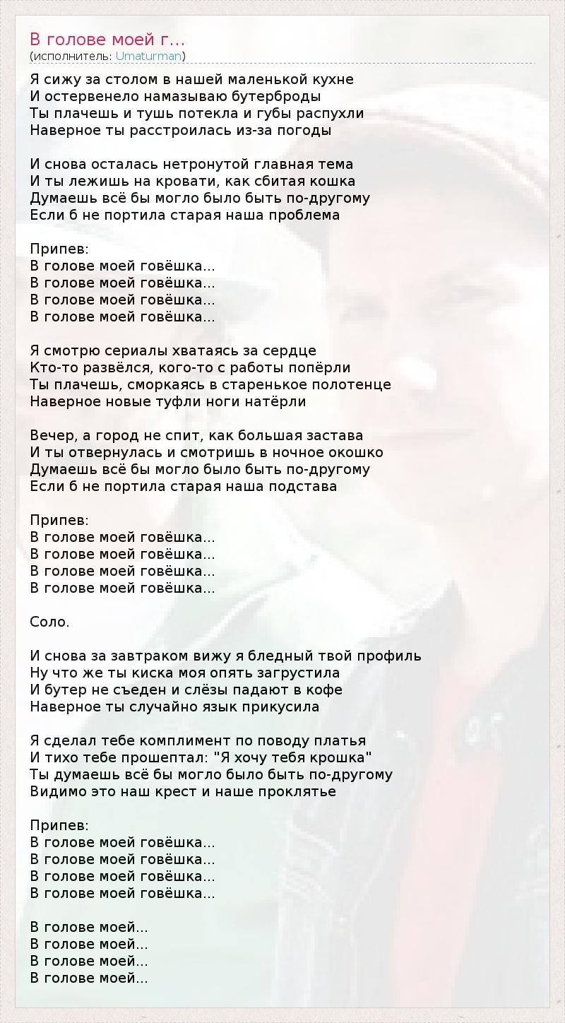 Я сижу за столом в нашей маленькой кухне И остервенело намазываю бутерброды Ты плачешь и тушь потекла и губы распухли Наверное ты расстроилась из-за погоды И снова осталась нетронутой главная тема И ты лежишь на кровати, как сбитая кошка Думаешь всё бы могло было быть по-другому Если б не портила старая наша проблема Припев: В голове моей говёшка... В голове моей говёшка... В голове моей говёшка... В голове моей говёшка... Я смотрю сериалы хватаясь за сердце Кто-то развёлся, кого-то с работы попёрли Ты плачешь, сморкаясь в старенькое полотенце Наверное новые туфли ноги натёрли Вечер, а город не спит, как большая застава И ты отвернулась и смотришь в ночное окошко Думаешь всё бы могло было быть по-другому Если б не портила старая наша подстава Припев: В голове моей говёшка... В голове моей говёшка... В голове моей говёшка... В голове моей говёшка... Соло. И снова за завтраком вижу я бледный твой профиль Ну что же ты киска моя опять загрустила И бутер не съеден и слёзы падают в кофе Наверное ты случайно язык прикусила Я сделал тебе комплимент по поводу платья И тихо тебе прошептал: "Я хочу тебя крошка" Ты думаешь всё бы могло было быть по-другому Видимо это наш крест и наше проклятье Припев: В голове моей говёшка... В голове моей говёшка... В голове моей говёшка... В голове моей говёшка... В голове моей... В голове моей... В голове моей... В голове моей...