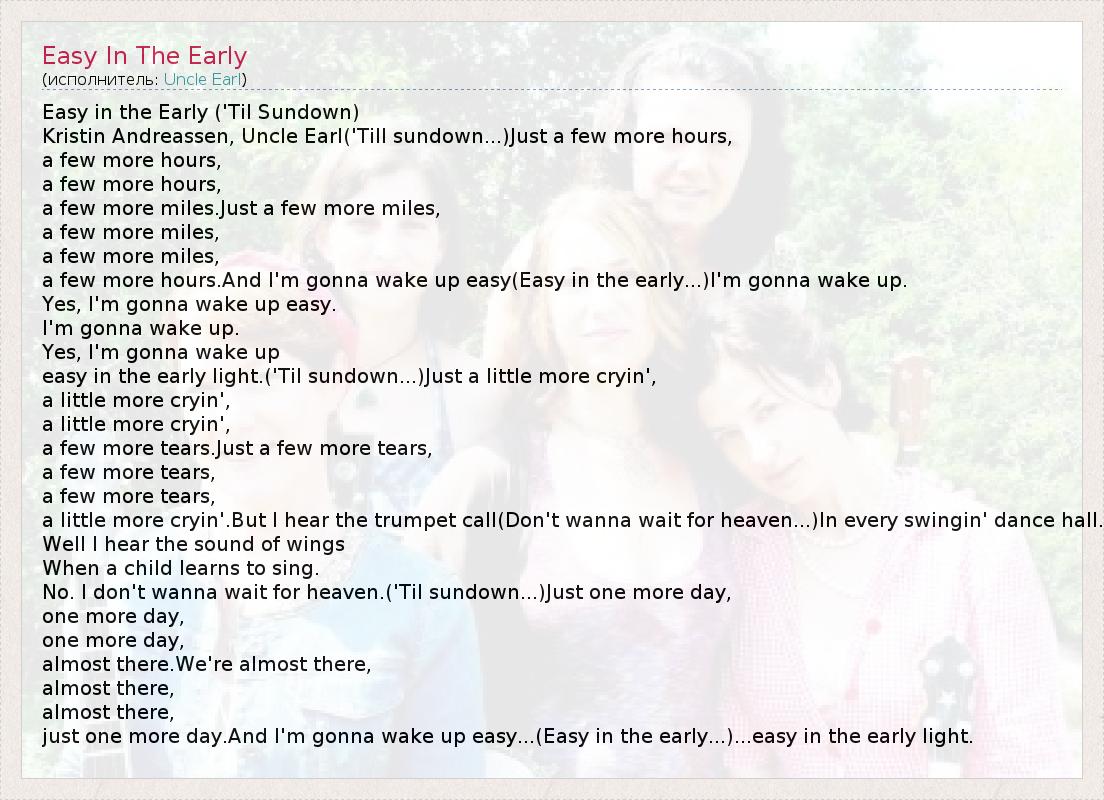 a few more hours.And I'm gonna wake up easy(Easy in the early...)I'm gonna wake up.