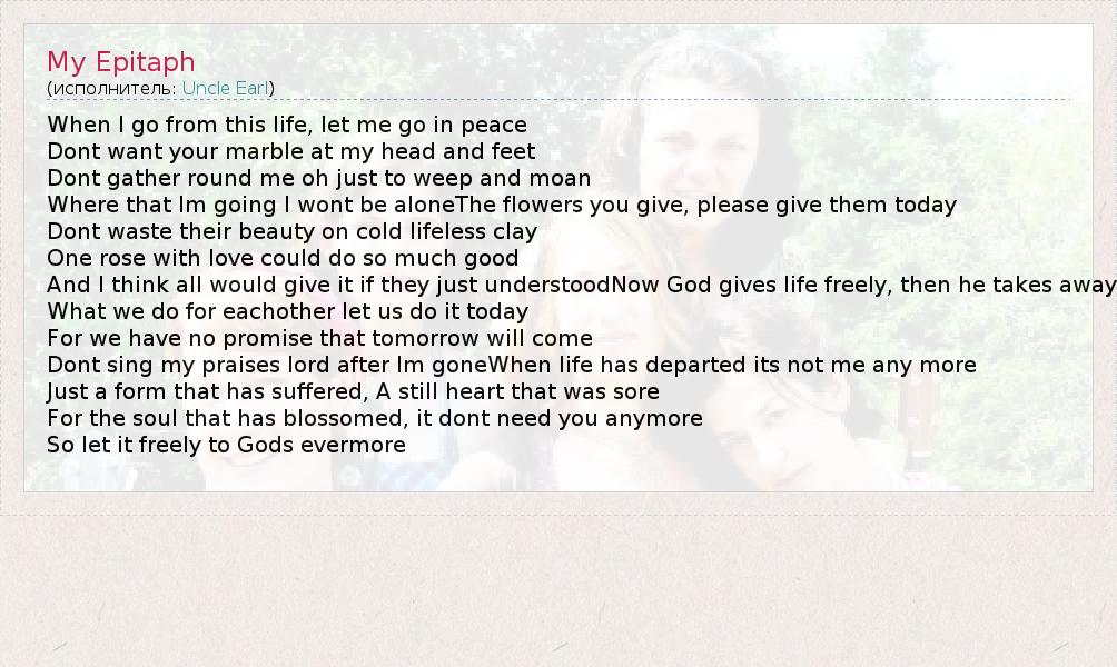 When I go from this life, let me go in peace Dont want your marble at my head and feet Dont gather round me oh just to weep and moan Where that Im going I wont be aloneThe flowers you give, please give them today Dont waste their beauty on cold lifeless clay One rose with love could do so much good And I think all would give it if they just understoodNow God gives life freely, then he takes away What we do for eachother let us do it today For we have no promise that tomorrow will come Dont sing my praises lord after Im goneWhen life has departed its not me any more Just a form that has suffered, A still heart that was sore For the soul that has blossomed, it dont need you anymore So let it freely to Gods evermore