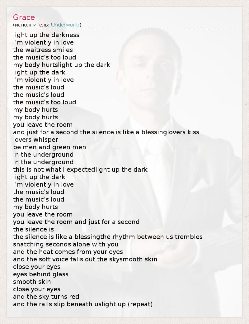 light up the darkness I'm violently in love the waitress smiles the music's too loud my body hurtslight up the dark light up the dark I'm violently in love the music's loud the music's loud the music's too loud my body hurts my body hurts you leave the room and just for a second the silence is like a blessinglovers kiss lovers whisper be men and green men in the underground in the underground this is not what I expectedlight up the dark light up the dark I'm violently in love the music's loud the music's loud my body hurts you leave the room you leave the room and just for a second the silence is the silence is like a blessingthe rhythm between us trembles snatching seconds alone with you and the heat comes from your eyes and the soft voice falls out the skysmooth skin close your eyes eyes behind glass smooth skin close your eyes and the sky turns red and the rails slip beneath uslight up (repeat)