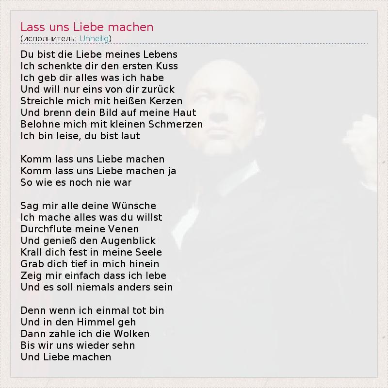 Du bist die Liebe meines Lebens Ich schenkte dir den ersten Kuss Ich geb dir alles was ich habe Und will nur eins von dir zurück Streichle mich mit heißen Kerzen Und brenn dein Bild auf meine Haut Belohne mich mit kleinen Schmerzen Ich bin leise, du bist laut Komm lass uns Liebe machen Komm lass uns Liebe machen ja So wie es noch nie war Sag mir alle deine Wünsche Ich mache alles was du willst Durchflute meine Venen Und genieß den Augenblick Krall dich fest in meine Seele Grab dich tief in mich hinein Zeig mir einfach dass ich lebe Und es soll niemals anders sein Denn wenn ich einmal tot bin Und in den Himmel geh Dann zahle ich die Wolken Bis wir uns wieder sehn Und Liebe machen