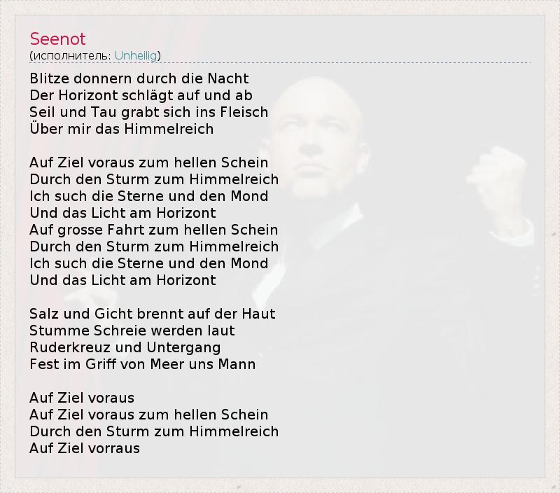 Blitze donnern durch die Nacht Der Horizont schlägt auf und ab Seil und Tau grabt sich ins Fleisch Über mir das Himmelreich Auf Ziel voraus zum hellen Schein Durch den Sturm zum Himmelreich Ich such die Sterne und den Mond Und das Licht am Horizont Auf grosse Fahrt zum hellen Schein Durch den Sturm zum Himmelreich Ich such die Sterne und den Mond Und das Licht am Horizont Salz und Gicht brennt auf der Haut Stumme Schreie werden laut Ruderkreuz und Untergang Fest im Griff von Meer uns Mann Auf Ziel voraus Auf Ziel voraus zum hellen Schein Durch den Sturm zum Himmelreich Auf Ziel vorraus