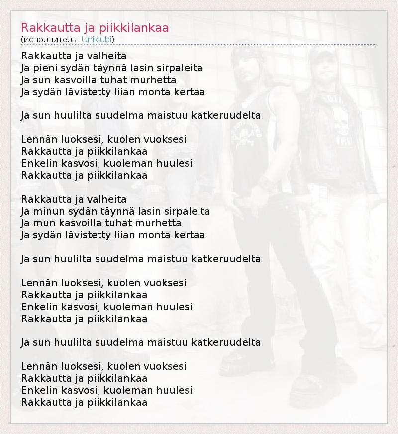 Это интересно:Uniklubi — финская рок-группа, исполняющая песни на родном, финском, языке, ранее известная под названием «Pincenez» (Пенсне).Изначально Uniklubi основали двое: Юсси Село (вокал) и Пасси Виитала (гитара). Затем из своей группы Bitch So Sweet пришёл Янне Село (гитара/бэк-вокал), брат вокалиста. Позже присоединились Тээму Райамяки (из поекта Jobo) и Антти Матикайнен. Выступать в нынешнем составе группа начала... продолжение