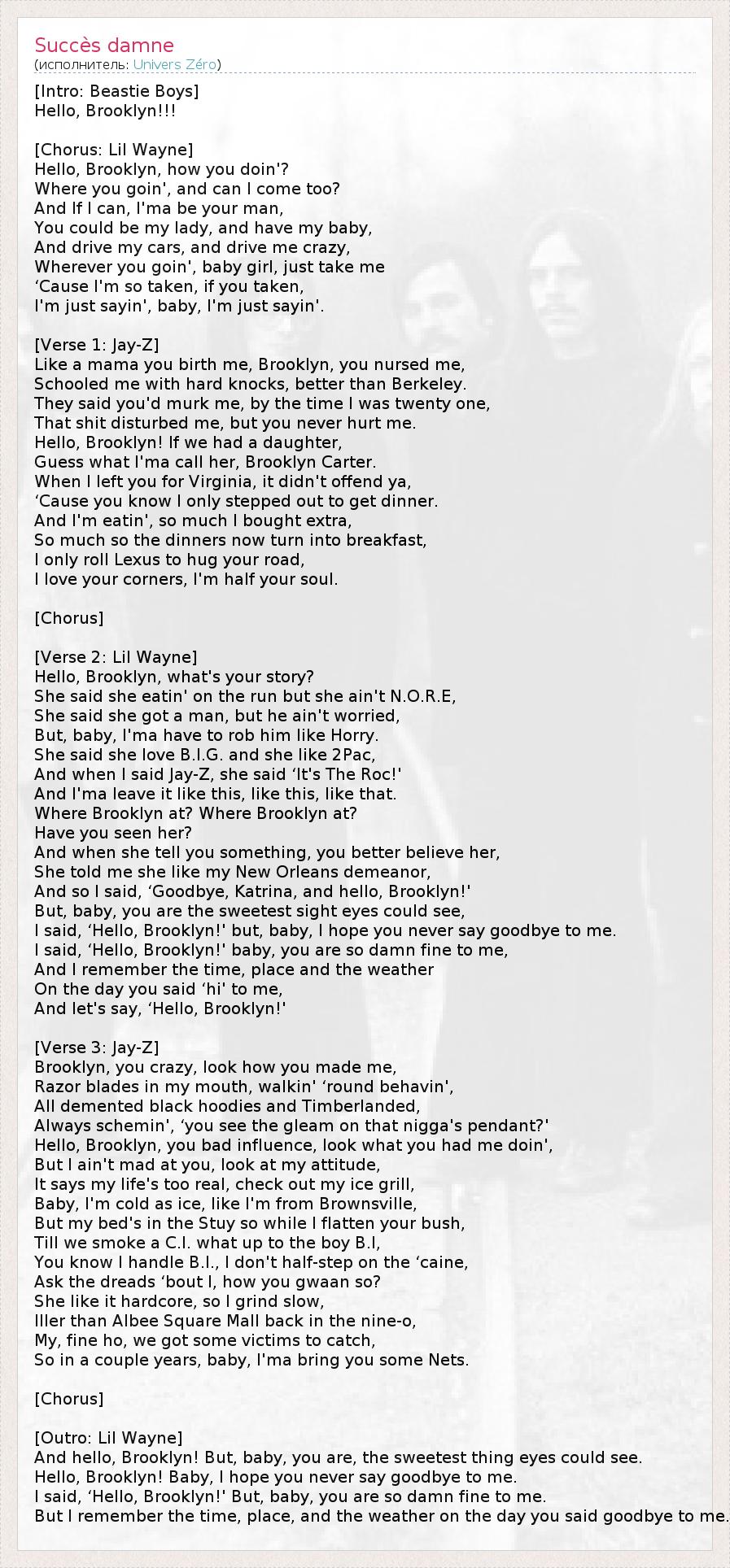 * — Первая песня под названием "Hello Brooklyn" — пятая часть "B-Boy Bouillabaisse", заключительной композиции со второго альбома нью-йоркской хип-хоп группы Beastie Boys "Paul's Boutique", выпущенного в 1989 году. Сэмпл из неё использован в данной песне.
