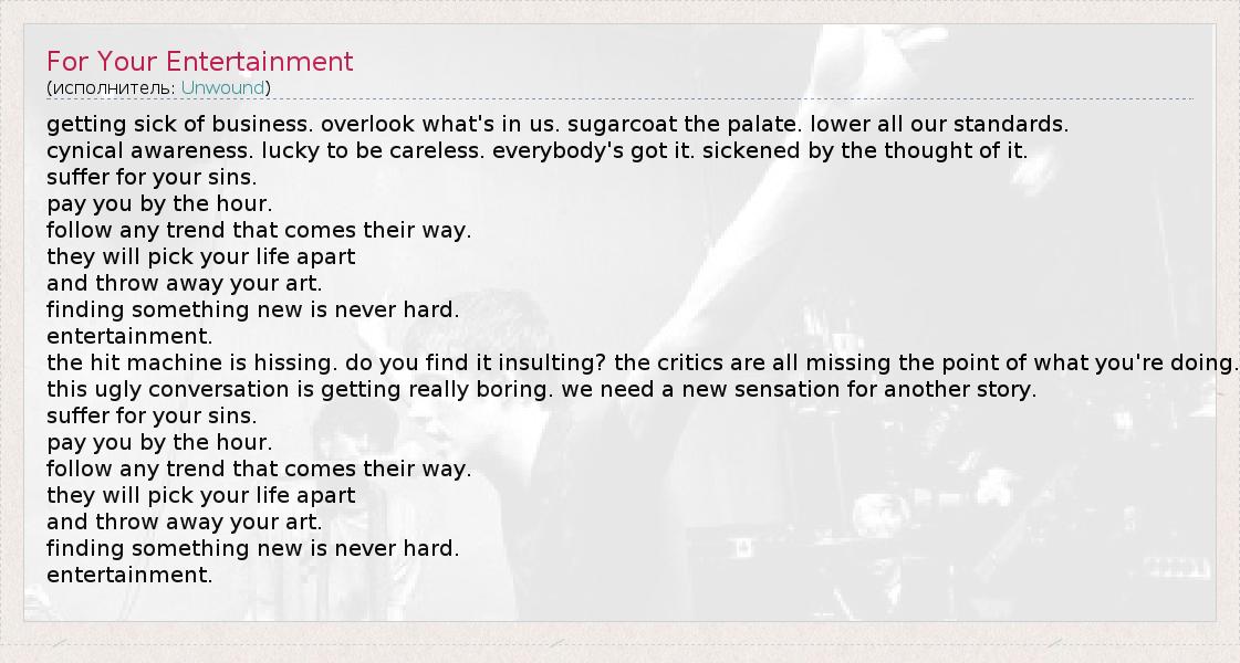 getting sick of business. overlook what's in us. sugarcoat the palate. lower all our standards. cynical awareness. lucky to be careless. everybody's got it. sickened by the thought of it. suffer for your sins. pay you by the hour. follow any trend that comes their way. they will pick your life apart and throw away your art. finding something new is never hard. entertainment. the hit machine is hissing. do you find it insulting? the critics are all missing the point of what you're doing. this ugly conversation is getting really boring. we need a new sensation for another story. suffer for your sins. pay you by the hour. follow any trend that comes their way. they will pick your life apart and throw away your art. finding something new is never hard. entertainment.