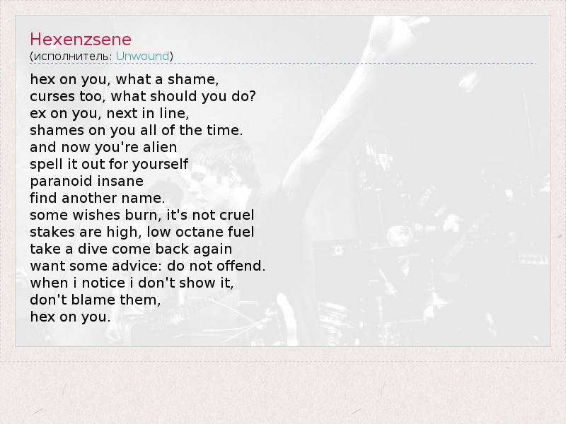 hex on you, what a shame, curses too, what should you do? ex on you, next in line, shames on you all of the time. and now you're alien spell it out for yourself paranoid insane find another name. some wishes burn, it's not cruel stakes are high, low octane fuel take a dive come back again want some advice: do not offend. when i notice i don't show it, don't blame them, hex on you.