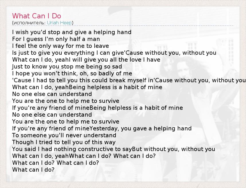 I wish you'd stop and give a helping hand For I guess I'm only half a man I feel the only way for me to leave Is just to give you everything I can give'Cause without you, without you What can I do, yeahI will give you all the love I have Just to know you stop me being so sad I hope you won't think, oh, so badly of me 'Cause I had to tell you this could break myself in'Cause without you, without you What can I do, yeahBeing helpless is a habit of mine No one else can understand You are the one to help me to survive If you're any friend of mineBeing helpless is a habit of mine No one else can understand You are the one to help me to survive If you're any friend of mineYesterday, you gave a helping hand To someone you'll never understand Though I tried to tell you of this way You said I had nothing constructive to sayBut without you, without you What can I do, yeahWhat can I do? What can I do? What can I do? What can I do? What can I do?