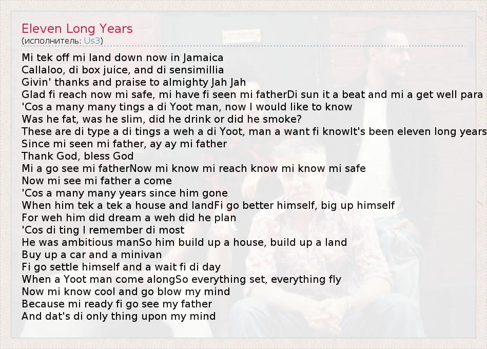 Mi tek off mi land down now in Jamaica Callaloo, di box juice, and di sensimillia Givin' thanks and praise to almighty Jah Jah Glad fi reach now mi safe, mi have fi seen mi fatherDi sun it a beat and mi a get well para 'Cos a many many tings a di Yoot man, now I would like to know Was he fat, was he slim, did he drink or did he smoke? These are di type a di tings a weh a di Yoot, man a want fi knowIt's been eleven long years Since mi seen mi father, ay ay mi father Thank God, bless God Mi a go see mi fatherNow mi know mi reach know mi know mi safe Now mi see mi father a come 'Cos a many many years since him gone When him tek a tek a house and landFi go better himself, big up himself For weh him did dream a weh did he plan 'Cos di ting I remember di most He was ambitious manSo him build up a house, build up a land Buy up a car and a minivan Fi go settle himself and a wait fi di day When a Yoot man come alongSo everything set, everything fly Now mi know cool and go blow my mind Because mi ready fi go see my father And dat's di only thing upon my mind