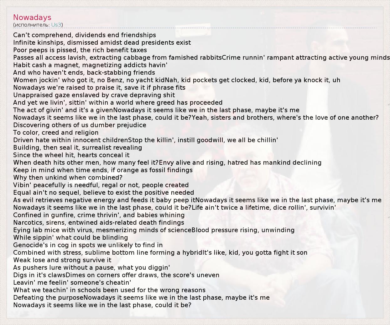 А как ты думаешь, о чем песня "Nowadays" ?