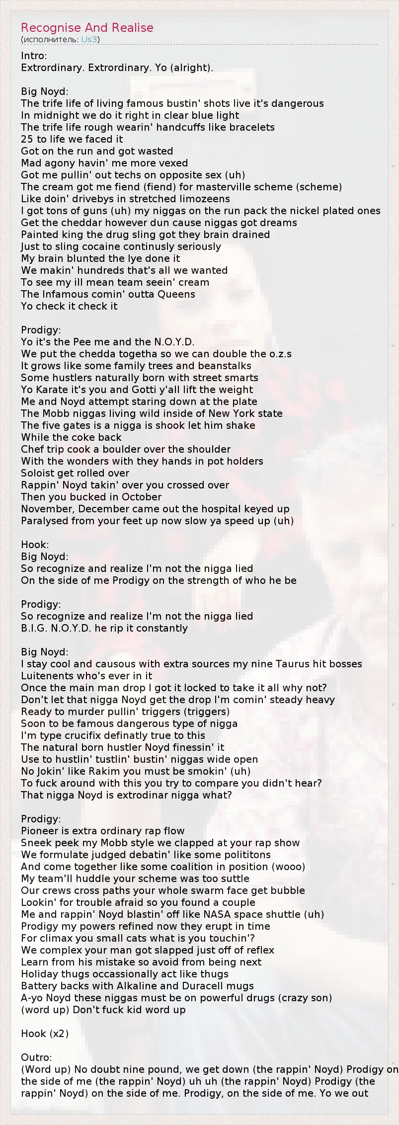 (Word up) No doubt nine pound, we get down (the rappin' Noyd) Prodigy on