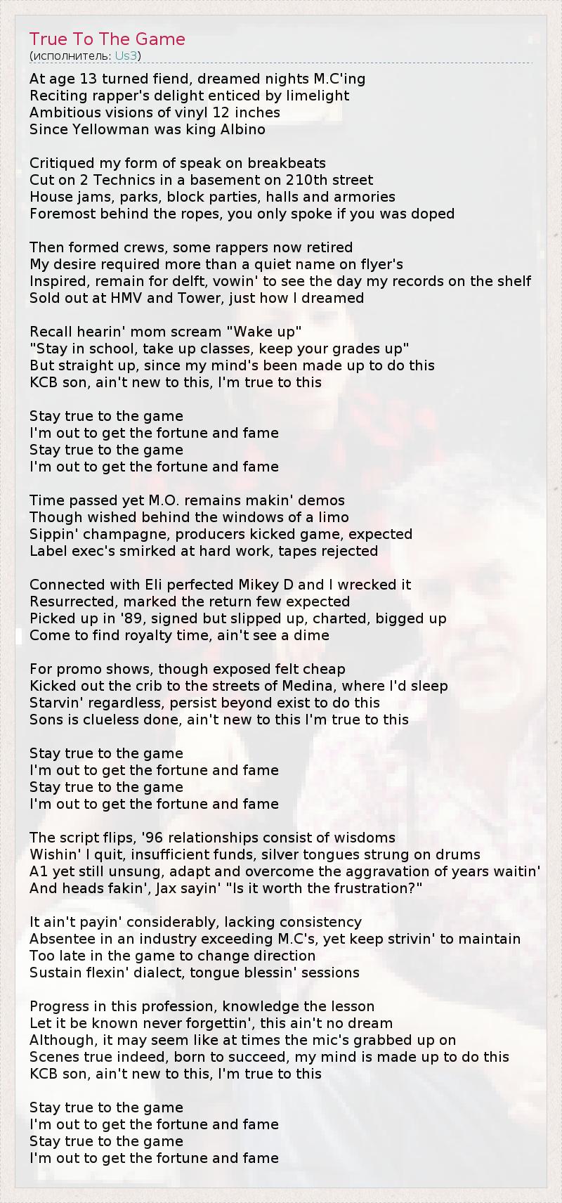 At age 13 turned fiend, dreamed nights M.C'ing Reciting rapper's delight enticed by limelight Ambitious visions of vinyl 12 inches Since Yellowman was king Albino Critiqued my form of speak on breakbeats Cut on 2 Technics in a basement on 210th street House jams, parks, block parties, halls and armories Foremost behind the ropes, you only spoke if you was doped Then formed crews, some rappers now retired My desire required more than a quiet name on flyer's Inspired, remain for delft, vowin' to see the day my records on the shelf Sold out at HMV and Tower, just how I dreamed Recall hearin' mom scream "Wake up" "Stay in school, take up classes, keep your grades up" But straight up, since my mind's been made up to do this KCB son, ain't new to this, I'm true to this Stay true to the game I'm out to get the fortune and fame Stay true to the game I'm out to get the fortune and fame Time passed yet M.O. remains makin' demos Though wished behind the windows of a limo Sippin' champagne, producers kicked game, expected Label exec's smirked at hard work, tapes rejected Connected with Eli perfected Mikey D and I wrecked it Resurrected, marked the return few expected Picked up in '89, signed but slipped up, charted, bigged up Come to find royalty time, ain't see a dime For promo shows, though exposed felt cheap Kicked out the crib to the streets of Medina, where I'd sleep Starvin' regardless, persist beyond exist to do this Sons is clueless done, ain't new to this I'm true to this Stay true to the game I'm out to get the fortune and fame Stay true to the game I'm out to get the fortune and fame The script flips, '96 relationships consist of wisdoms Wishin' I quit, insufficient funds, silver tongues strung on drums A1 yet still unsung, adapt and overcome the aggravation of years waitin' And heads fakin', Jax sayin' "Is it worth the frustration?" It ain't payin' considerably, lacking consistency Absentee in an industry exceeding M.C's, yet keep strivin' to maintain Too late in the game to change direction Sustain flexin' dialect, tongue blessin' sessions Progress in this profession, knowledge the lesson Let it be known never forgettin', this ain't no dream Although, it may seem like at times the mic's grabbed up on Scenes true indeed, born to succeed, my mind is made up to do this KCB son, ain't new to this, I'm true to this Stay true to the game I'm out to get the fortune and fame Stay true to the game I'm out to get the fortune and fame