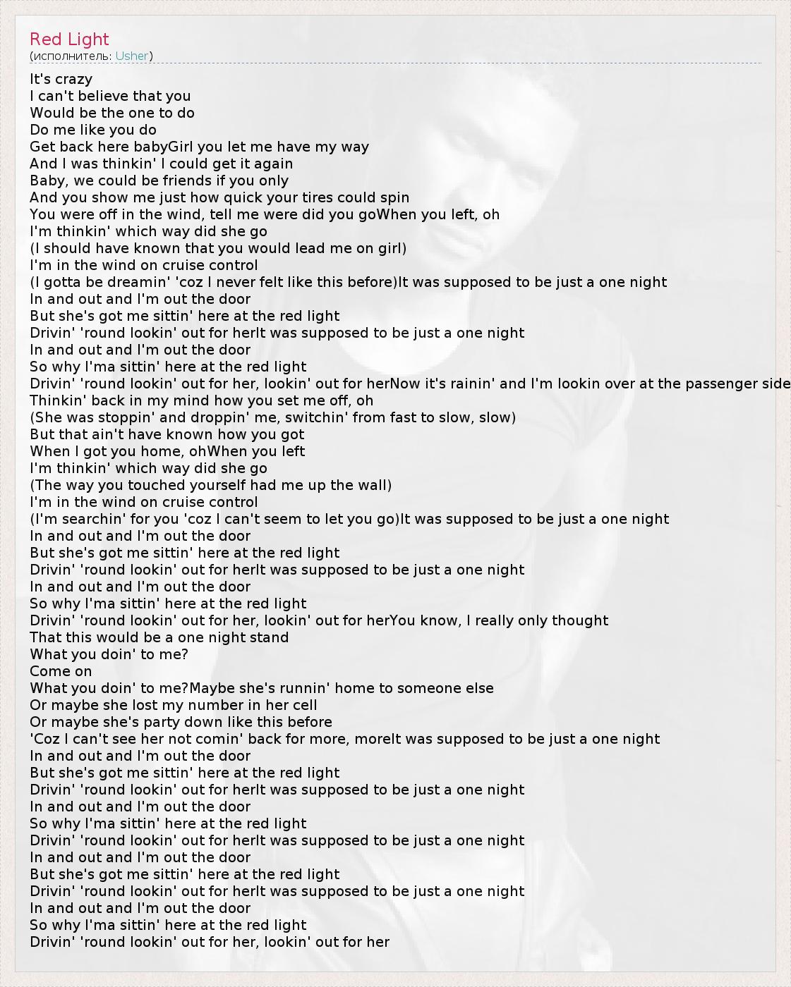 It's crazy I can't believe that you Would be the one to do Do me like you do Get back here babyGirl you let me have my way And I was thinkin' I could get it again Baby, we could be friends if you only And you show me just how quick your tires could spin You were off in the wind, tell me were did you goWhen you left, oh I'm thinkin' which way did she go (I should have known that you would lead me on girl) I'm in the wind on cruise control (I gotta be dreamin' 'coz I never felt like this before)It was supposed to be just a one night In and out and I'm out the door But she's got me sittin' here at the red light Drivin' 'round lookin' out for herIt was supposed to be just a one night In and out and I'm out the door So why I'ma sittin' here at the red light Drivin' 'round lookin' out for her, lookin' out for herNow it's rainin' and I'm lookin over at the passenger side Thinkin' back in my mind how you set me off, oh (She was stoppin' and droppin' me, switchin' from fast to slow, slow) But that ain't have known how you got When I got you home, ohWhen you left I'm thinkin' which way did she go (The way you touched yourself had me up the wall) I'm in the wind on cruise control (I'm searchin' for you 'coz I can't seem to let you go)It was supposed to be just a one night In and out and I'm out the door But she's got me sittin' here at the red light Drivin' 'round lookin' out for herIt was supposed to be just a one night In and out and I'm out the door So why I'ma sittin' here at the red light Drivin' 'round lookin' out for her, lookin' out for herYou know, I really only thought That this would be a one night stand What you doin' to me? Come on What you doin' to me?Maybe she's runnin' home to someone else Or maybe she lost my number in her cell Or maybe she's party down like this before 'Coz I can't see her not comin' back for more, moreIt was supposed to be just a one night In and out and I'm out the door But she's got me sittin' here at the red light Drivin' 'round lookin' out for herIt was supposed to be just a one night In and out and I'm out the door So why I'ma sittin' here at the red light Drivin' 'round lookin' out for herIt was supposed to be just a one night In and out and I'm out the door But she's got me sittin' here at the red light Drivin' 'round lookin' out for herIt was supposed to be just a one night In and out and I'm out the door So why I'ma sittin' here at the red light Drivin' 'round lookin' out for her, lookin' out for her