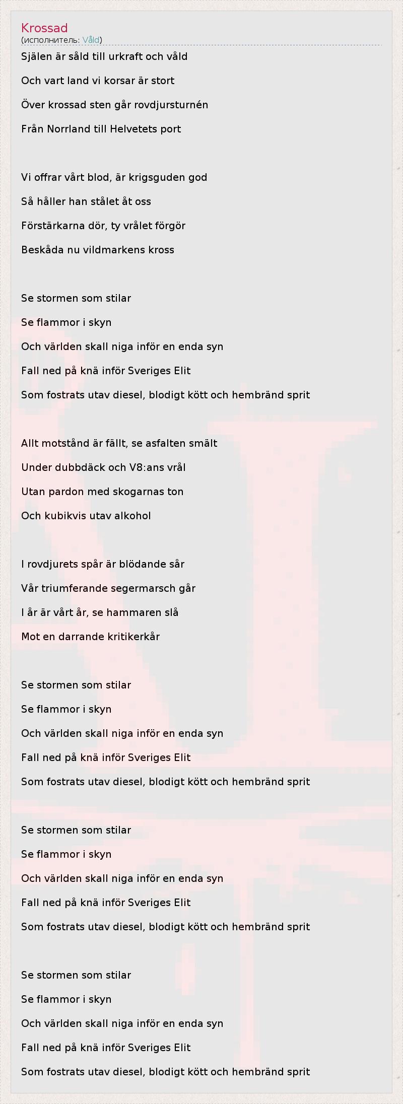 Själen är såld till urkraft och våld Och vart land vi korsar är stort Över krossad sten går rovdjursturnén Från Norrland till Helvetets port Vi offrar vårt blod, är krigsguden god Så håller han stålet åt oss Förstärkarna dör, ty vrålet förgör Beskåda nu vildmarkens kross Se stormen som stilar Se flammor i skyn Och världen skall niga inför en enda syn Fall ned på knä inför Sveriges Elit Som fostrats utav diesel, blodigt kött och hembränd sprit Allt motstånd är fällt, se asfalten smält Under dubbdäck och V8:ans vrål Utan pardon med skogarnas ton Och kubikvis utav alkohol I rovdjurets spår är blödande sår Vår triumferande segermarsch går I år är vårt år, se hammaren slå Mot en darrande kritikerkår Se stormen som stilar Se flammor i skyn Och världen skall niga inför en enda syn Fall ned på knä inför Sveriges Elit Som fostrats utav diesel, blodigt kött och hembränd sprit Se stormen som stilar Se flammor i skyn Och världen skall niga inför en enda syn Fall ned på knä inför Sveriges Elit Som fostrats utav diesel, blodigt kött och hembränd sprit Se stormen som stilar Se flammor i skyn Och världen skall niga inför en enda syn Fall ned på knä inför Sveriges Elit Som fostrats utav diesel, blodigt kött och hembränd sprit