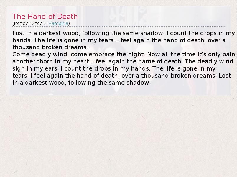 А как ты думаешь, о чем песня "The Hand of Death" ?