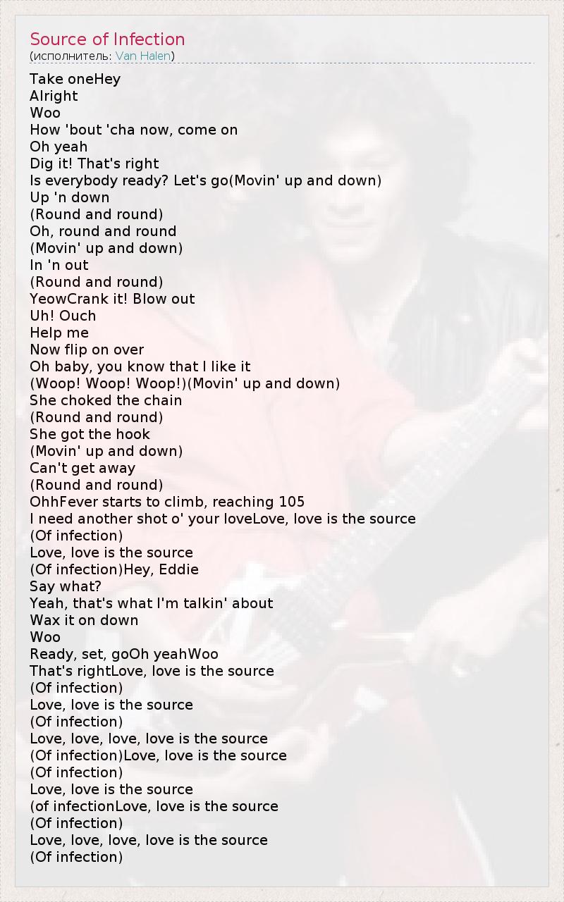 Take oneHey Alright Woo How 'bout 'cha now, come on Oh yeah Dig it! That's right Is everybody ready? Let's go(Movin' up and down) Up 'n down (Round and round) Oh, round and round (Movin' up and down) In 'n out (Round and round) YeowCrank it! Blow out Uh! Ouch Help me Now flip on over Oh baby, you know that I like it (Woop! Woop! Woop!)(Movin' up and down) She choked the chain (Round and round) She got the hook (Movin' up and down) Can't get away (Round and round) OhhFever starts to climb, reaching 105 I need another shot o' your loveLove, love is the source (Of infection) Love, love is the source (Of infection)Hey, Eddie Say what? Yeah, that's what I'm talkin' about Wax it on down Woo Ready, set, goOh yeahWoo That's rightLove, love is the source (Of infection) Love, love is the source (Of infection) Love, love, love, love is the source (Of infection)Love, love is the source (Of infection) Love, love is the source (of infectionLove, love is the source (Of infection) Love, love, love, love is the source (Of infection)