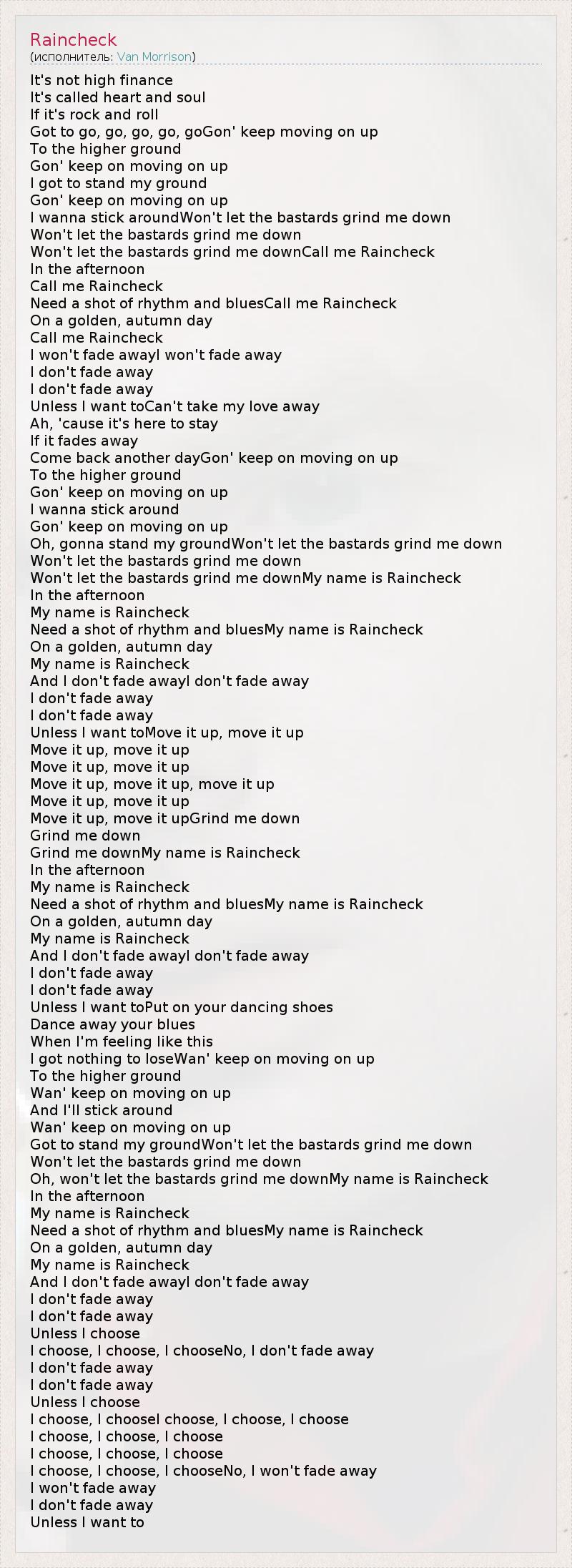 Oh, won't let the bastards grind me downMy name is Raincheck
