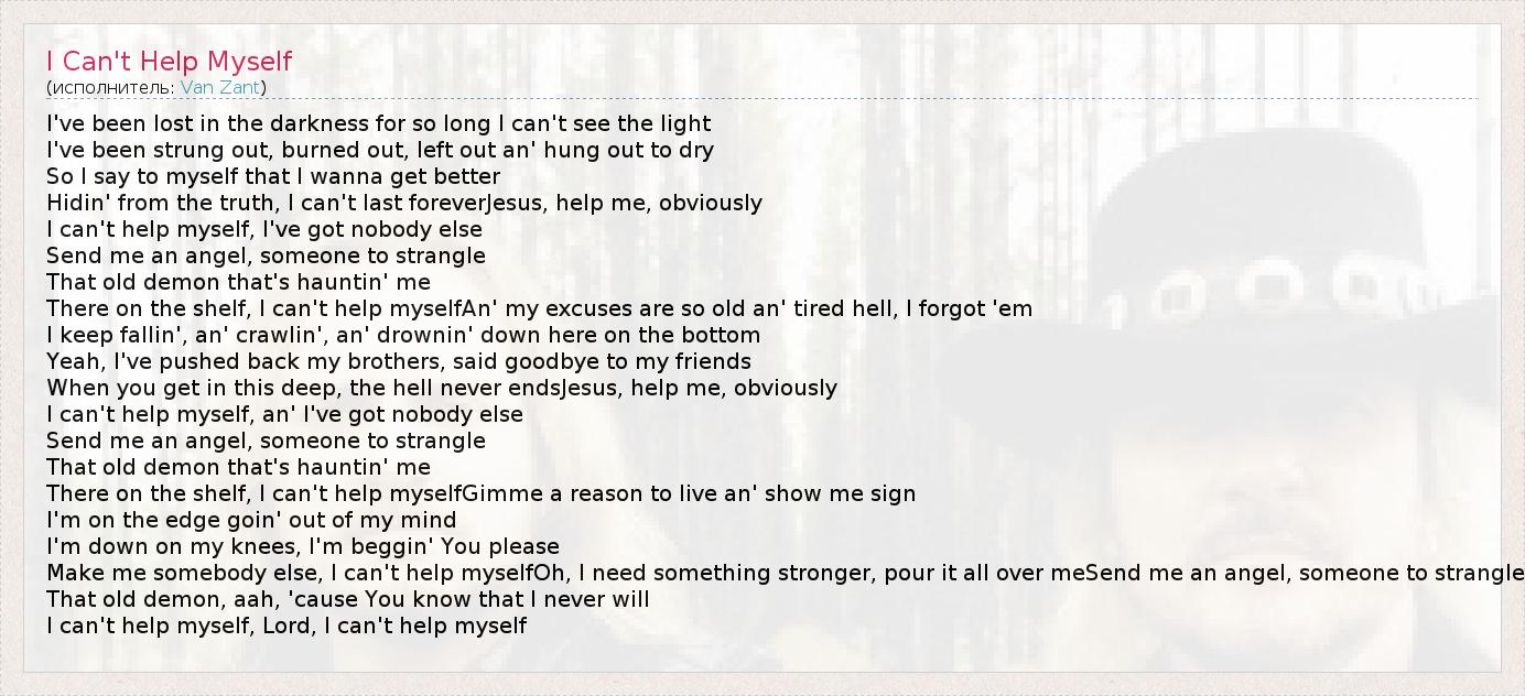 I've been lost in the darkness for so long I can't see the light I've been strung out, burned out, left out an' hung out to dry So I say to myself that I wanna get better Hidin' from the truth, I can't last foreverJesus, help me, obviously I can't help myself, I've got nobody else Send me an angel, someone to strangle That old demon that's hauntin' me There on the shelf, I can't help myselfAn' my excuses are so old an' tired hell, I forgot 'em I keep fallin', an' crawlin', an' drownin' down here on the bottom Yeah, I've pushed back my brothers, said goodbye to my friends When you get in this deep, the hell never endsJesus, help me, obviously I can't help myself, an' I've got nobody else Send me an angel, someone to strangle That old demon that's hauntin' me There on the shelf, I can't help myselfGimme a reason to live an' show me sign I'm on the edge goin' out of my mind I'm down on my knees, I'm beggin' You please Make me somebody else, I can't help myselfOh, I need something stronger, pour it all over meSend me an angel, someone to strangle That old demon, aah, 'cause You know that I never will I can't help myself, Lord, I can't help myself