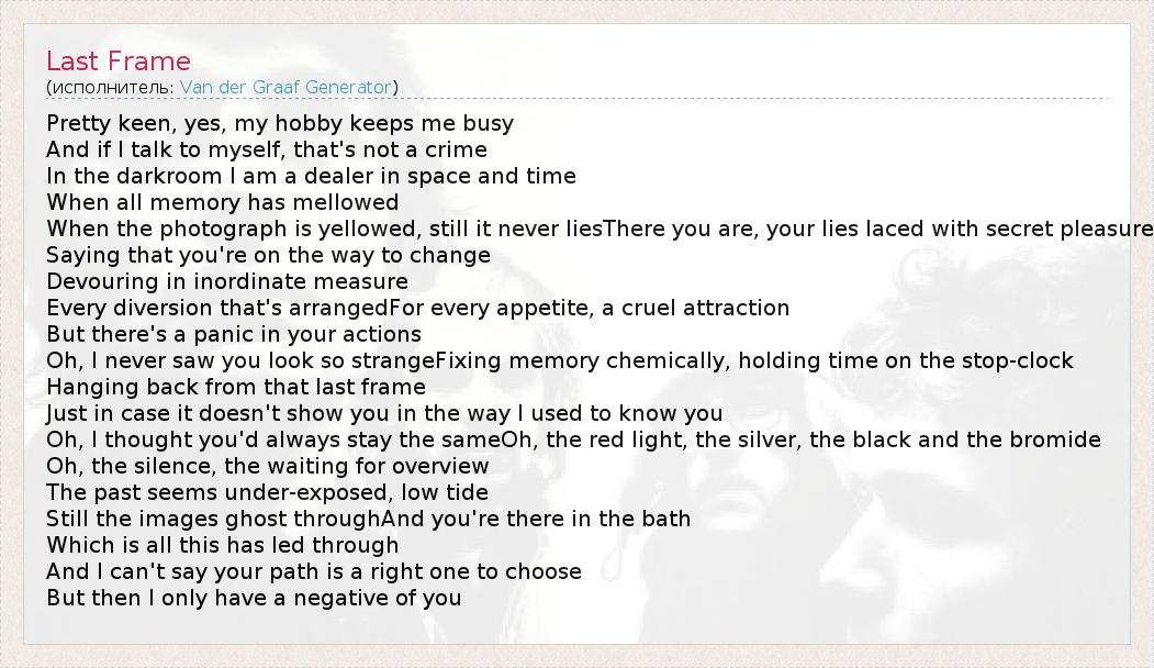 When the photograph is yellowed, still it never liesThere you are, your lies laced with secret pleasure