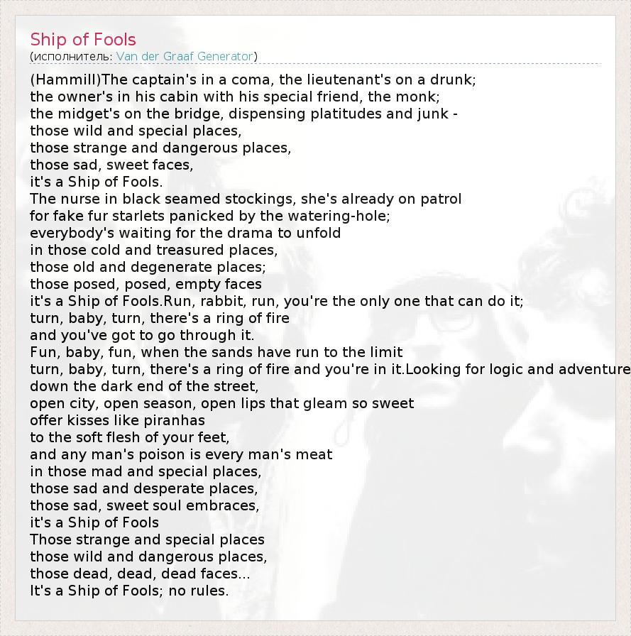 (Hammill)The captain's in a coma, the lieutenant's on a drunk; the owner's in his cabin with his special friend, the monk; the midget's on the bridge, dispensing platitudes and junk - those wild and special places, those strange and dangerous places, those sad, sweet faces, it's a Ship of Fools. The nurse in black seamed stockings, she's already on patrol for fake fur starlets panicked by the watering-hole; everybody's waiting for the drama to unfold in those cold and treasured places, those old and degenerate places; those posed, posed, empty faces it's a Ship of Fools.Run, rabbit, run, you're the only one that can do it; turn, baby, turn, there's a ring of fire and you've got to go through it. Fun, baby, fun, when the sands have run to the limit turn, baby, turn, there's a ring of fire and you're in it.Looking for logic and adventure down the dark end of the street, open city, open season, open lips that gleam so sweet offer kisses like piranhas to the soft flesh of your feet, and any man's poison is every man's meat in those mad and special places, those sad and desperate places, those sad, sweet soul embraces, it's a Ship of Fools Those strange and special places those wild and dangerous places, those dead, dead, dead faces... It's a Ship of Fools; no rules.