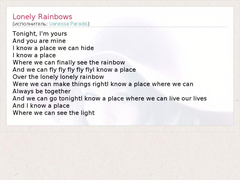 Tonight, I'm yours And you are mine I know a place we can hide I know a place Where we can finally see the rainbow And we can fly fly fly fly flyI know a place Over the lonely lonely rainbow Were we can make things rightI know a place where we can Always be together And we can go tonightI know a place where we can live our lives And I know a place Where we can see the light