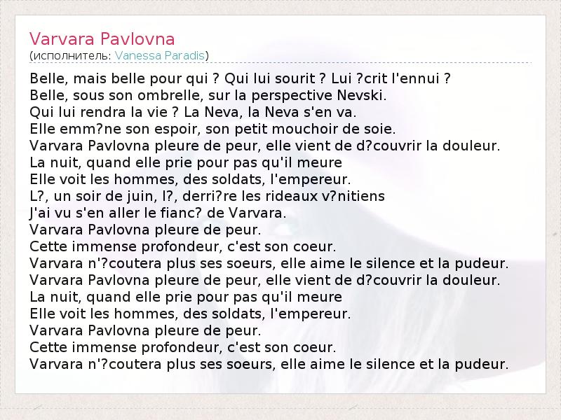 А как ты думаешь, о чем песня "Varvara Pavlovna" ?