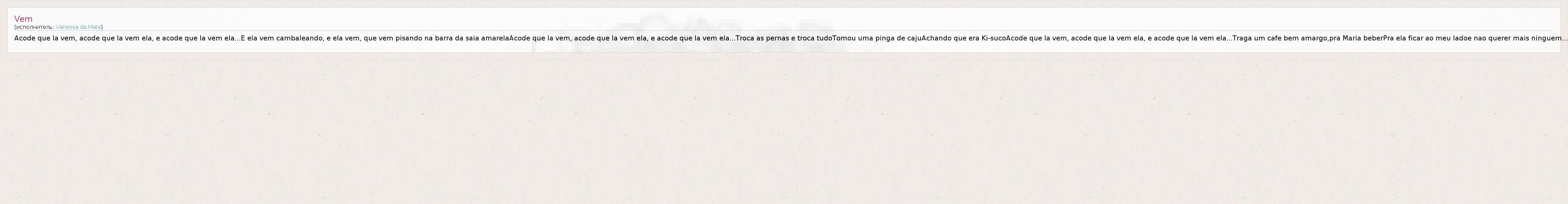 Acode que la vem, acode que la vem ela, e acode que la vem ela...E ela vem cambaleando, e ela vem, que vem pisando na barra da saia amarelaAcode que la vem, acode que la vem ela, e acode que la vem ela...Troca as pernas e troca tudoTomou uma pinga de cajuAchando que era Ki-sucoAcode que la vem, acode que la vem ela, e acode que la vem ela...Traga um cafe bem amargo,pra Maria beberPra ela ficar ao meu ladoe nao querer mais ninguem...