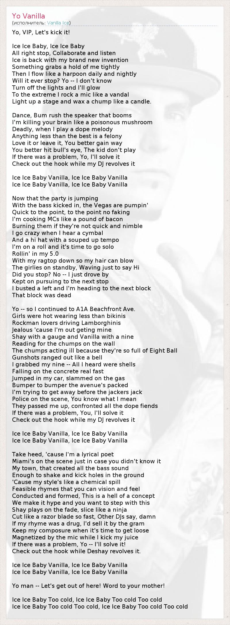Yo, VIP, Let's kick it! Ice Ice Baby, Ice Ice Baby All right stop, Collaborate and listen Ice is back with my brand new invention Something grabs a hold of me tightly Then I flow like a harpoon daily and nightly Will it ever stop? Yo -- I don't know Turn off the lights and I'll glow To the extreme I rock a mic like a vandal Light up a stage and wax a chump like a candle. Dance, Bum rush the speaker that booms I'm killing your brain like a poisonous mushroom Deadly, when I play a dope melody Anything less than the best is a felony Love it or leave it, You better gain way You better hit bull's eye, The kid don't play If there was a problem, Yo, I'll solve it Check out the hook while my DJ revolves it Ice Ice Baby Vanilla, Ice Ice Baby Vanilla Ice Ice Baby Vanilla, Ice Ice Baby Vanilla Now that the party is jumping With the bass kicked in, the Vegas are pumpin' Quick to the point, to the point no faking I'm cooking MCs like a pound of bacon Burning them if they're not quick and nimble I go crazy when I hear a cymbal And a hi hat with a souped up tempo I'm on a roll and it's time to go solo Rollin' in my 5.0 With my ragtop down so my hair can blow The girlies on standby, Waving just to say Hi Did you stop? No -- I just drove by Kept on pursuing to the next stop I busted a left and I'm heading to the next block That block was dead Yo -- so I continued to A1A Beachfront Ave. Girls were hot wearing less than bikinis Rockman lovers driving Lamborghinis Jealous 'cause I'm out geting mine Shay with a gauge and Vanilla with a nine Reading for the chumps on the wall The chumps acting ill because they're so full of Eight Ball Gunshots ranged out like a bell I grabbed my nine -- All I heard were shells Falling on the concrete real fast Jumped in my car, slammed on the gas Bumper to bumper the avenue's packed I'm trying to get away before the jackers jack Police on the scene, You know what I mean They passed me up, confronted all the dope fiends If there was a problem, You, I'll solve it Check out the hook while my DJ revolves it Ice Ice Baby Vanilla, Ice Ice Baby Vanilla Ice Ice Baby Vanilla, Ice Ice Baby Vanilla Take heed, 'cause I'm a lyrical poet Miami's on the scene just in case you didn't know it My town, that created all the bass sound Enough to shake and kick holes in the ground 'Cause my style's like a chemical spill Feasible rhymes that you can vision and feel Conducted and formed, This is a hell of a concept We make it hype and you want to step with this Shay plays on the fade, slice like a ninja Cut like a razor blade so fast, Other DJs say, damn If my rhyme was a drug, I'd sell it by the gram Keep my composure when it's time to get loose Magnetized by the mic while I kick my juice If there was a problem, Yo -- I'll solve it! Check out the hook while Deshay revolves it. Ice Ice Baby Vanilla, Ice Ice Baby Vanilla Ice Ice Baby Vanilla, Ice Ice Baby Vanilla Yo man -- Let's get out of here! Word to your mother! Ice Ice Baby Too cold, Ice Ice Baby Too cold Too cold Ice Ice Baby Too cold Too cold, Ice Ice Baby Too cold Too cold