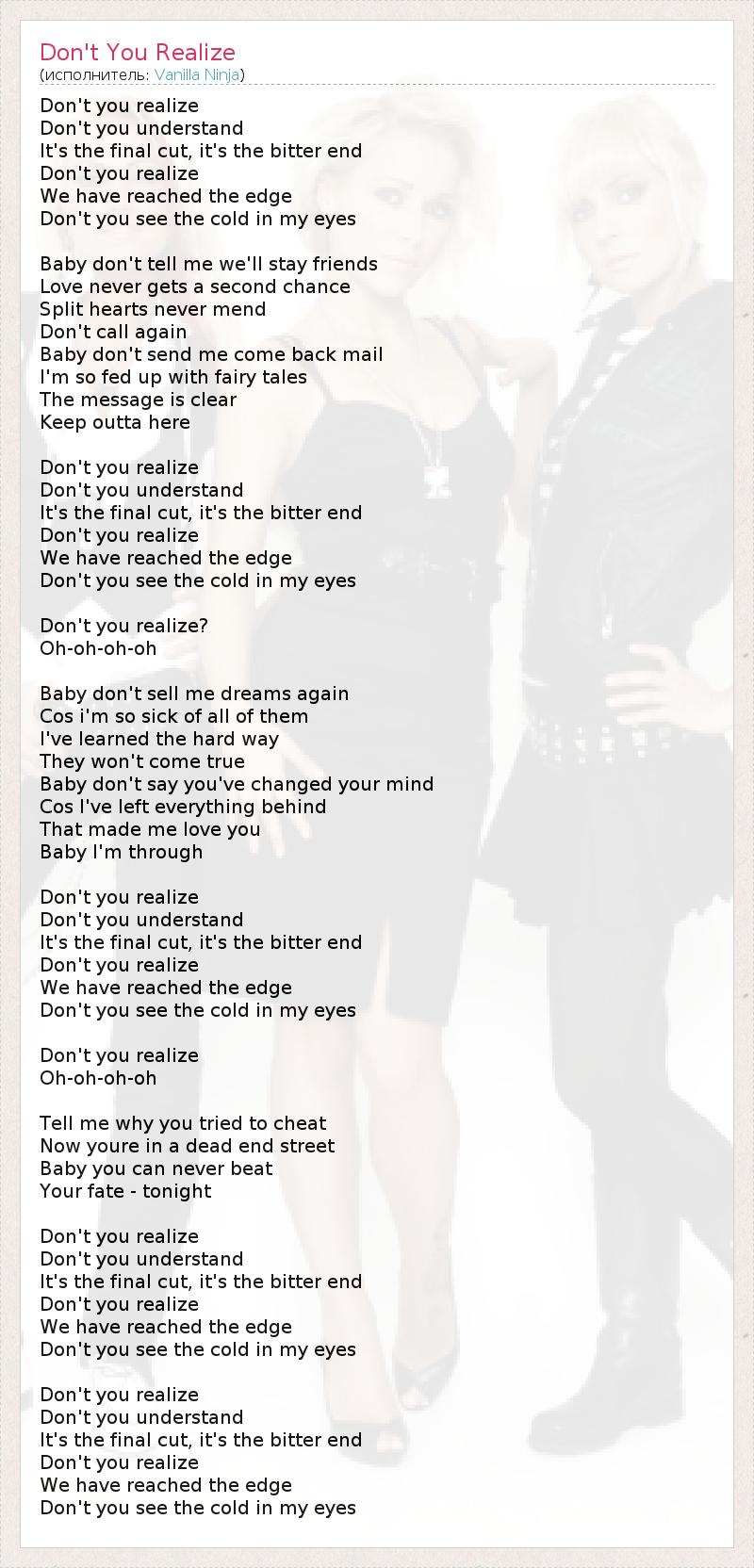 А как ты думаешь, о чем песня "Don't You Realize" ?