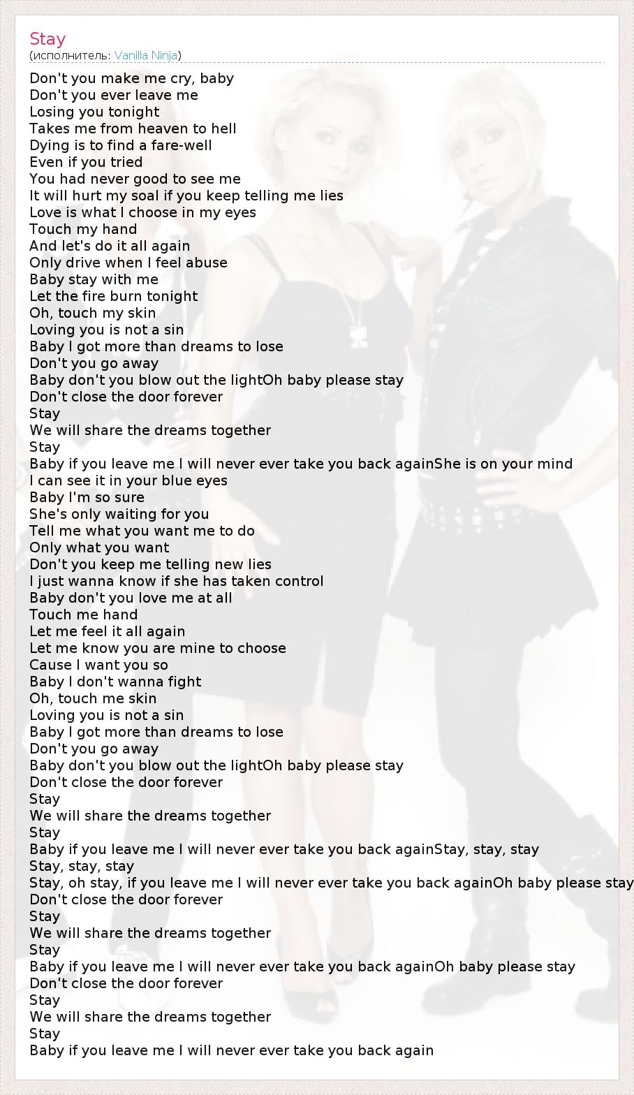 Stay, oh stay, if you leave me I will never ever take you back againOh baby please stay