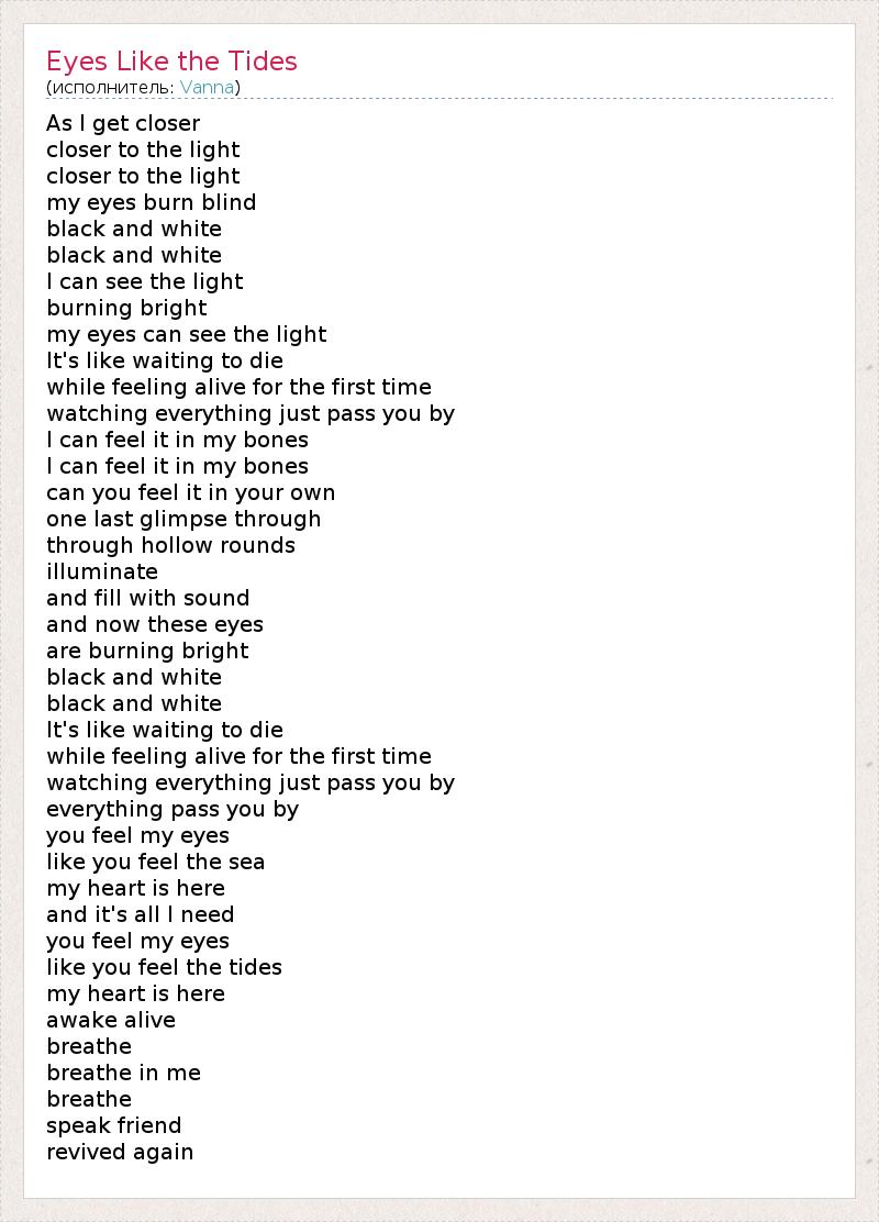 Как я ближе ближе к свету ближе к свету мои глаза горят слепой черно-белое изображение черно-белое изображение Я вижу свет ярко горит мои глаза могут увидеть свет Это как в ожидании смерти в то время как чувства живы впервые смотреть все просто пройти мимо вас Я чувствую это в моих костях Я чувствую это в моих костях Вы можете чувствовать это в свой собственный последний проблеск через через полые раундов освещать и заполнить со звуком и теперь эти глаза горят ярким черно-белое изображение черно-белое изображение Это как в ожидании смерти в то время как чувства живы впервые смотреть все просто пройти мимо вас все мимо вас Вы чувствуете, глаза как вы считаете, на море мое сердце здесь и это все что мне нужно Вы чувствуете, глаза как вы считаете, приливы мое сердце здесь проснулся живым дышать дышать во мне дышать говорить друг возрождался вновь