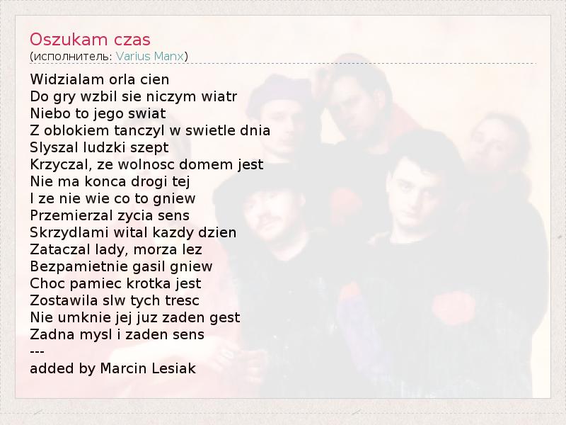 Это интересно:Varius Manx — польская музыкальная рок-группа, основанная в 1990 году в городе Лодзь, лидером и композитором которой является Роберт Янсон. Название группы расшифровывается как «странный кот породы Мэнкс». История группы - Первый альбом, The Beginning (Начало), состоящий целиком из инструментальной музыки, вышел в 1990 году и добился значительного успеха. Следующий за ним альбом — The New Shape (Новая фигура)... продолжение