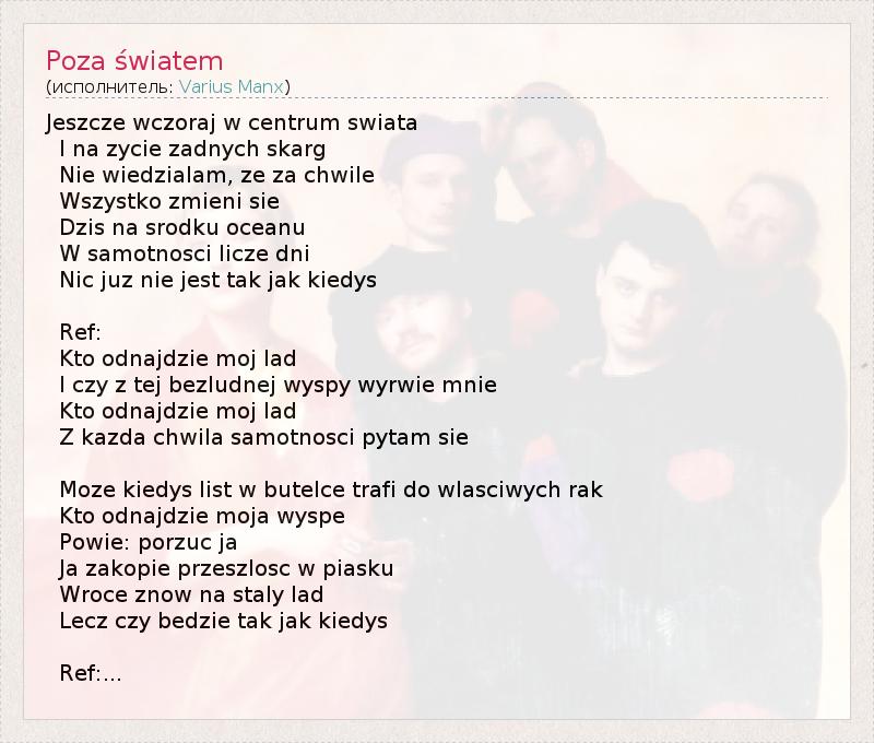 Jeszcze wczoraj w centrum swiata I na zycie zadnych skarg Nie wiedzialam, ze za chwile Wszystko zmieni sie Dzis na srodku oceanu W samotnosci licze dni Nic juz nie jest tak jak kiedys Ref: Kto odnajdzie moj lad I czy z tej bezludnej wyspy wyrwie mnie Kto odnajdzie moj lad Z kazda chwila samotnosci pytam sie Moze kiedys list w butelce trafi do wlasciwych rak Kto odnajdzie moja wyspe Powie: porzuc ja Ja zakopie przeszlosc w piasku Wroce znow na staly lad Lecz czy bedzie tak jak kiedys Ref:...