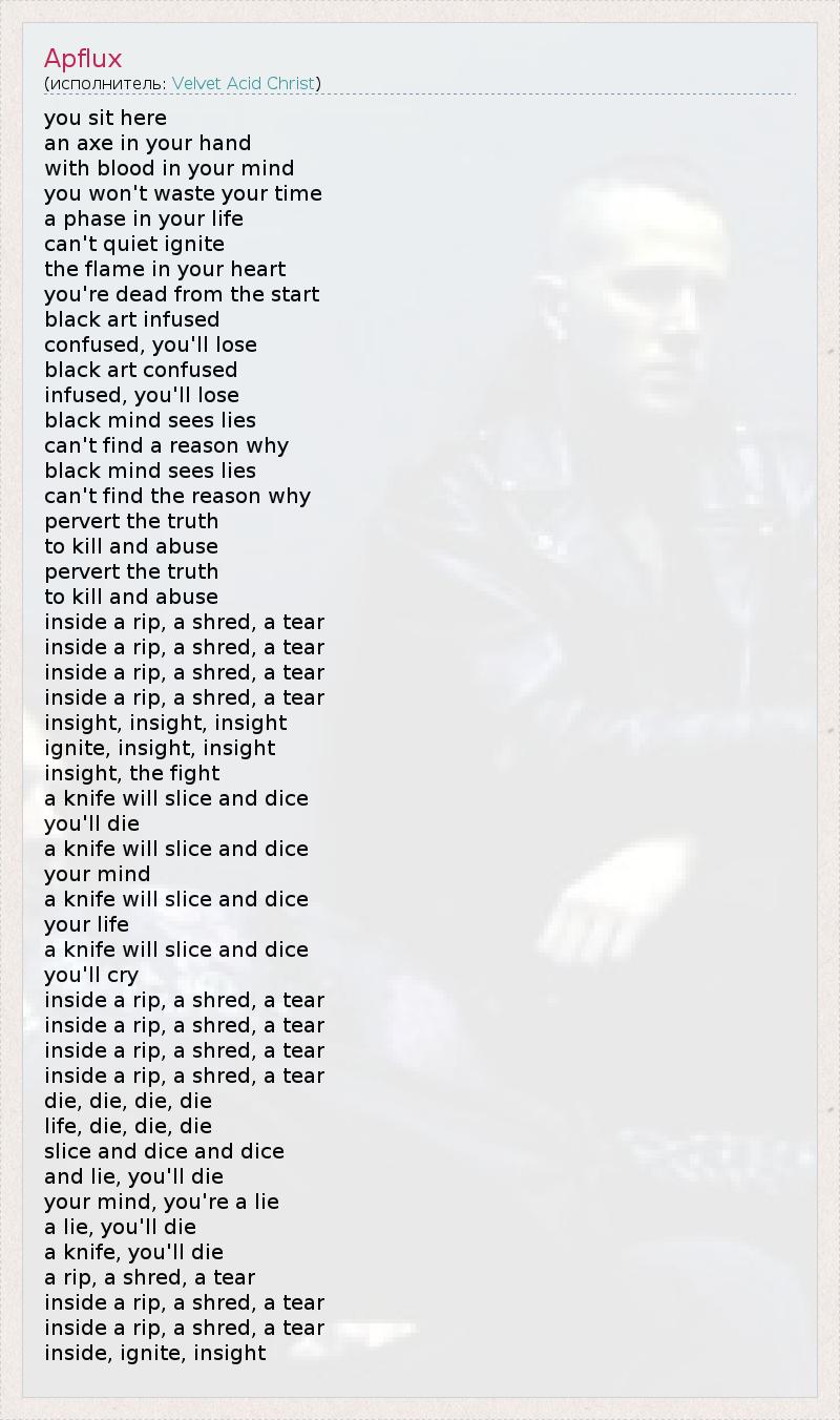 Это интересно:Velvet Acid Christ (сокращённо VAC) — музыкальная группа из США, играющая электро-индастриал. Основана в 1990 году в Денвере, штат Колорадо. Лидер группы — Брайан Эриксон (Bryan Erickson). Совместив разные стили и направления в музыке (EBM, industrial, trip-hop, gothic,... продолжение
