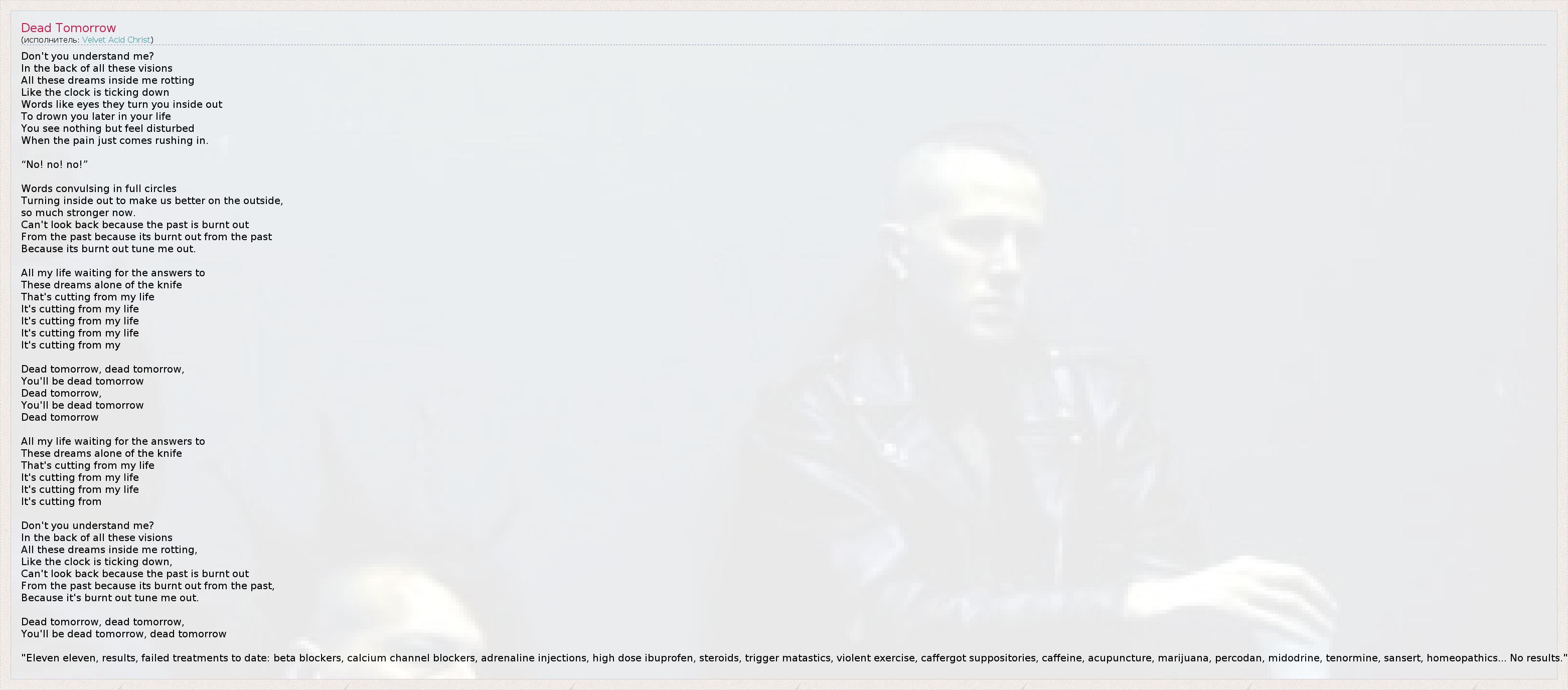 Ты не понимаешь меня? За всеми этими видениями Все эти сны во мне гниют, Как часы отсчитывают время. Слова, как глаза, они выворачивают тебя наизнанку, Чтобы потом утопить в твоей жизни. Ты ничего не видишь, но чувствуешь беспокойство, Когда боль стремительно наступает. "Нет, нет, нет!" Слова, потрясающие на полных оборотах, Выворачивающие наизнанку, чтобы улучшить нас внешне, Теперь гораздо сильнее. Я не могу оглянуться назад, потому что прошлое сгорело дотла, Из прошлого, потому что оно сгорело, из прошлого, Потому что оно сгорело, я отключаюсь. Всю свою жизнь в ожидании ответа Лишь на эти сны о ноже, Урезающем мою жизнь. Он урезает мою жизнь, Он урезает мою жизнь, Он урезает мою жизнь, Он урезает мою... Мертвое завтра, мертвое завтра, Ты будешь мертв завтра, Мертвое завтра, Ты будешь мертв завтра, Мертвое завтра. Всю свою жизнь в ожидании ответа Только на эти сны о ноже, Урезающем мою жизнь. Он урезает мою жизнь, Он урезает мою жизнь, Он урезает мою... Ты не понимаешь меня? За всеми этими видениями Все эти сны во мне гниют, Как часы отсчитывают время. Я не могу оглянуться назад, потому что прошлое сгорело дотла, Из прошлого, потому что оно сгорело, из прошлого, Потому что оно сгорело, я отключаюсь. Мертвое завтра, мертвое завтра, Ты будешь мертв завтра, мертв завтра. "Одиннадцать-одиннадцать. Результаты. То, что пока не помогло: бета-блокаторы, кальциевые блокираторы каналов, инъекции адреналина, большие дозы ибупрофена, стероиды, пусковые метастики, энергичные упражнения, свечи кафергота, кофеин, акупунктура, марихуана, перкодан, мидодрин, тенормин, сансерт, гомеопатия... Безрезультатно".
