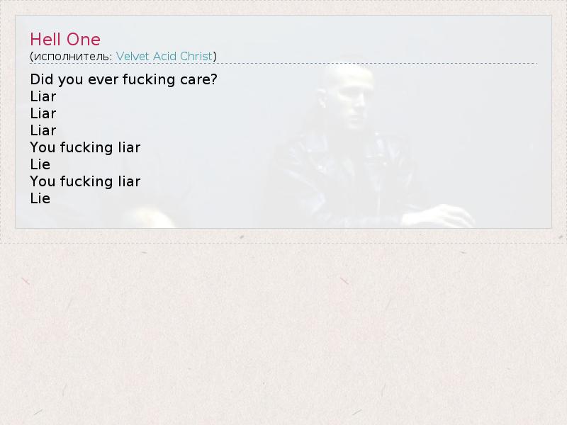 Это интересно:Velvet Acid Christ (сокращённо VAC) — музыкальная группа из США, играющая электро-индастриал. Основана в 1990 году в Денвере, штат Колорадо. Лидер группы — Брайан Эриксон (Bryan Erickson). Совместив разные стили и направления в музыке (EBM, industrial, trip-hop, gothic,... продолжение