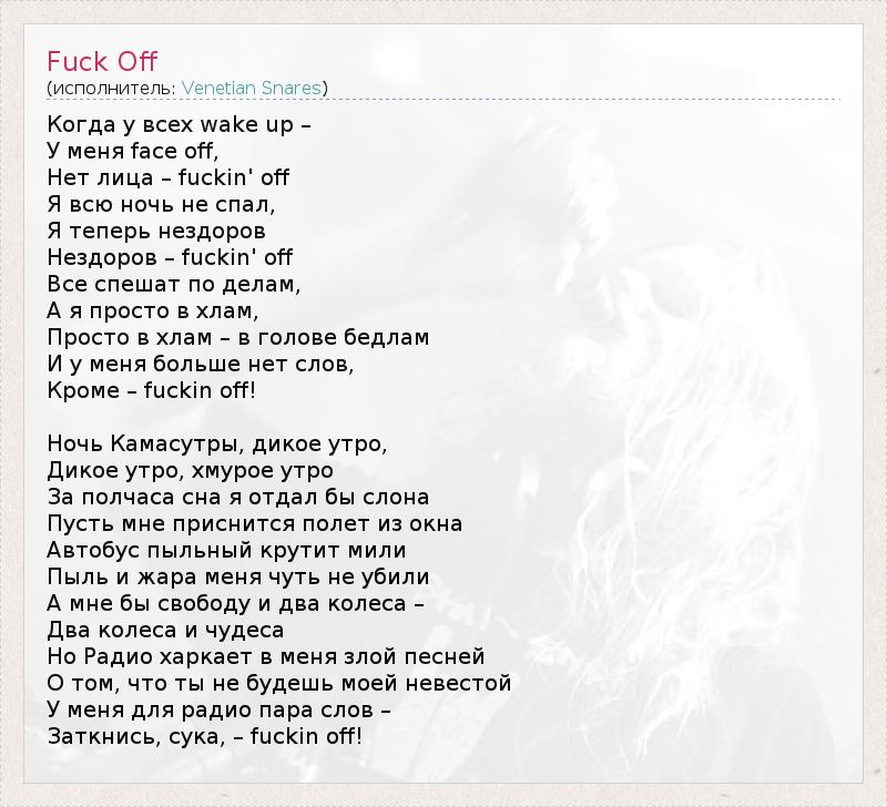 Когда у всех wake up – У меня face off, Нет лица – fuckin' off Я всю ночь не спал, Я теперь нездоров Нездоров – fuckin' off Все спешат по делам, А я просто в хлам, Просто в хлам – в голове бедлам И у меня больше нет слов, Кроме – fuckin off! Ночь Камасутры, дикое утро, Дикое утро, хмурое утро За полчаса сна я отдал бы слона Пусть мне приснится полет из окна Автобус пыльный крутит мили Пыль и жара меня чуть не убили А мне бы свободу и два колеса – Два колеса и чудеса Но Радио харкает в меня злой песней О том, что ты не будешь моей невестой У меня для радио пара слов – Заткнись, сука, – fuckin off!